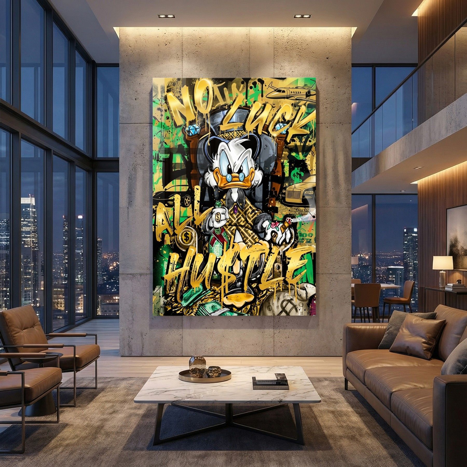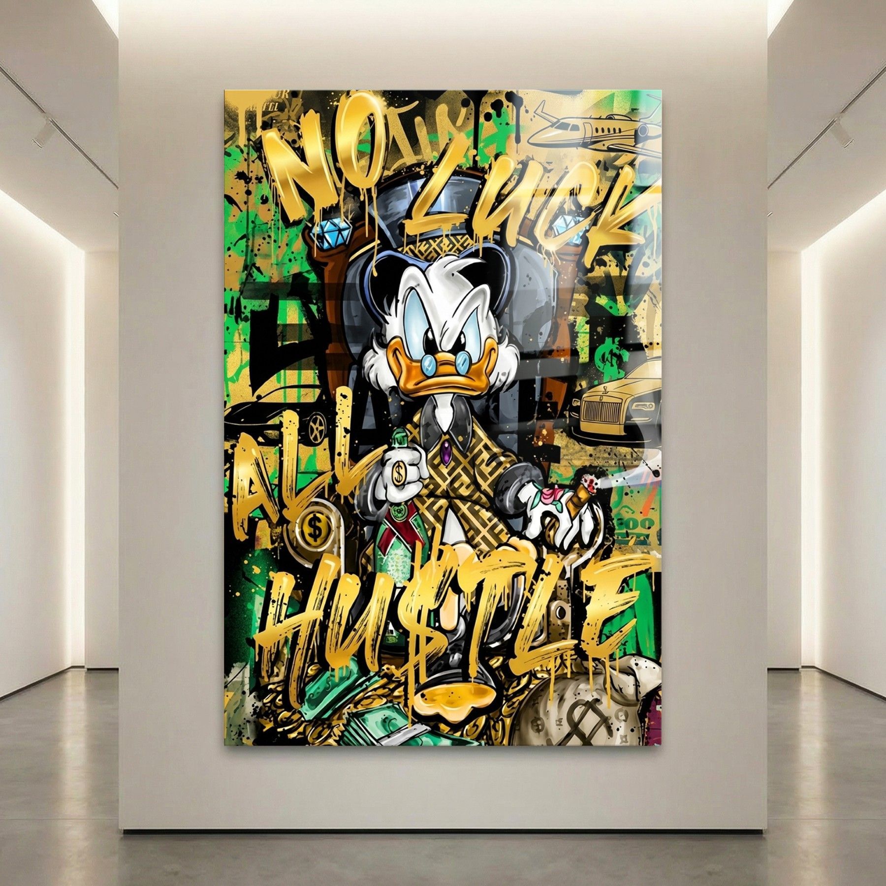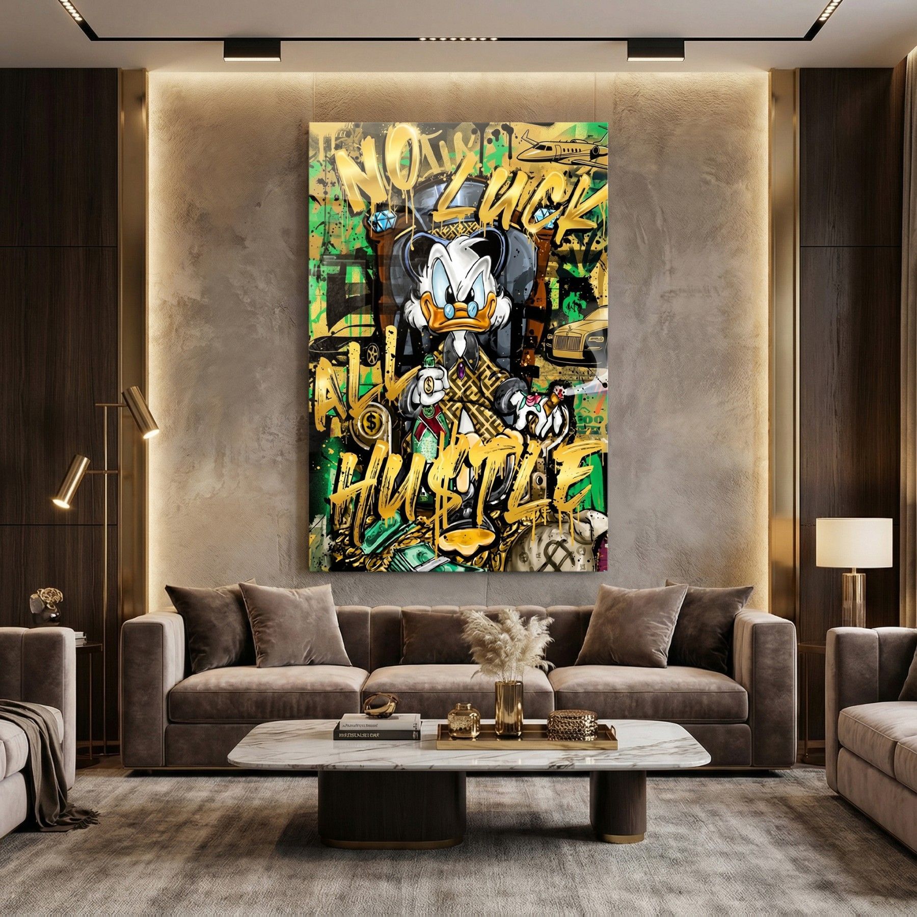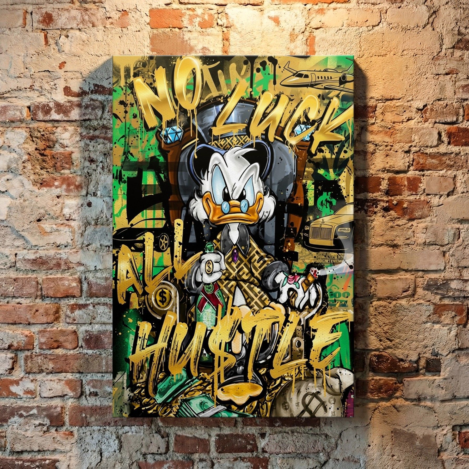 Dagobert Duck, NO LUCK-ALL HUSTLE. Pop Art kunst, Wandbild Acrylglas, Leinwand