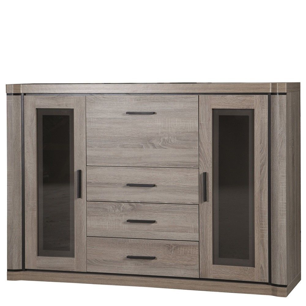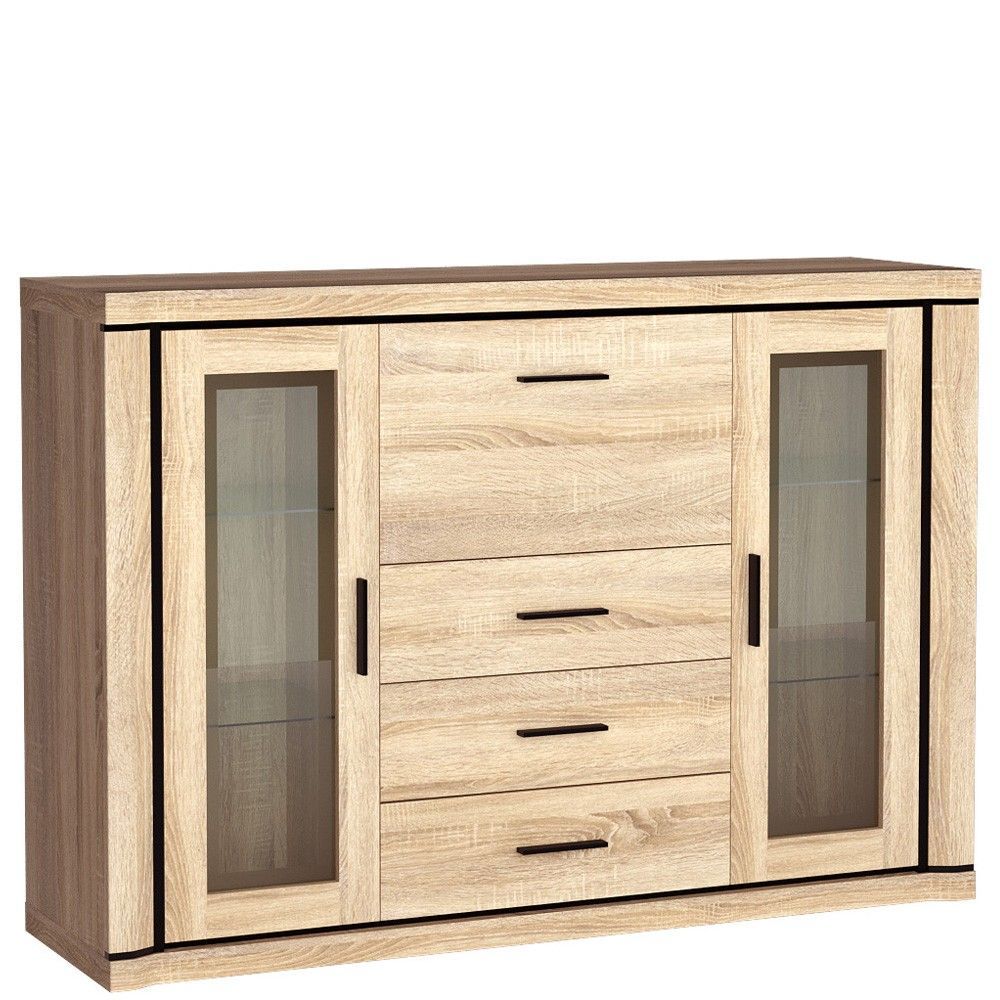 Marmex Dallas D7 - Kommode - Vitrine 157 cm; mit drei Schubladen und einer aufklappbaren Stange; Glasregale hinter der Tür; Türen mit Glaseinsätzen; Moderne Kommode für das Wohnzimmer Farbe: Trüffel Eiche Sonoma Eiche Maße: Breite: 157 cm Höhe: 111 cm Tiefe: 43.5 cm Ausführung: 22 Funktionselemente