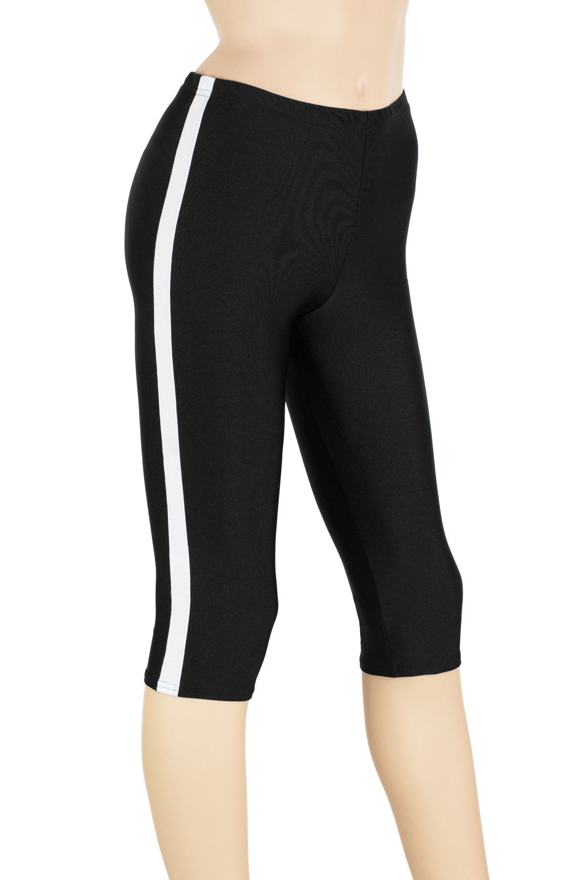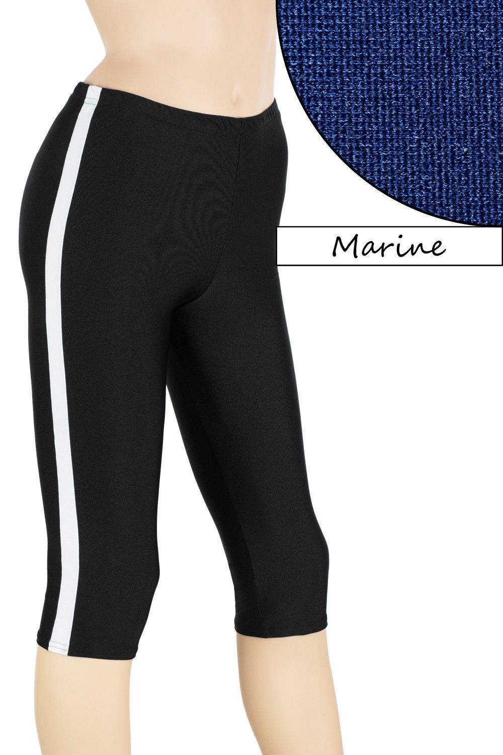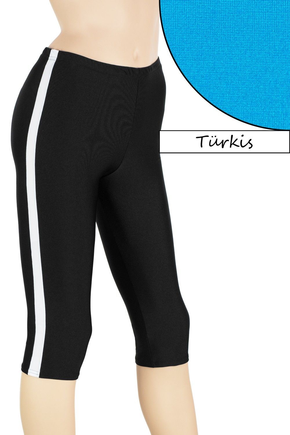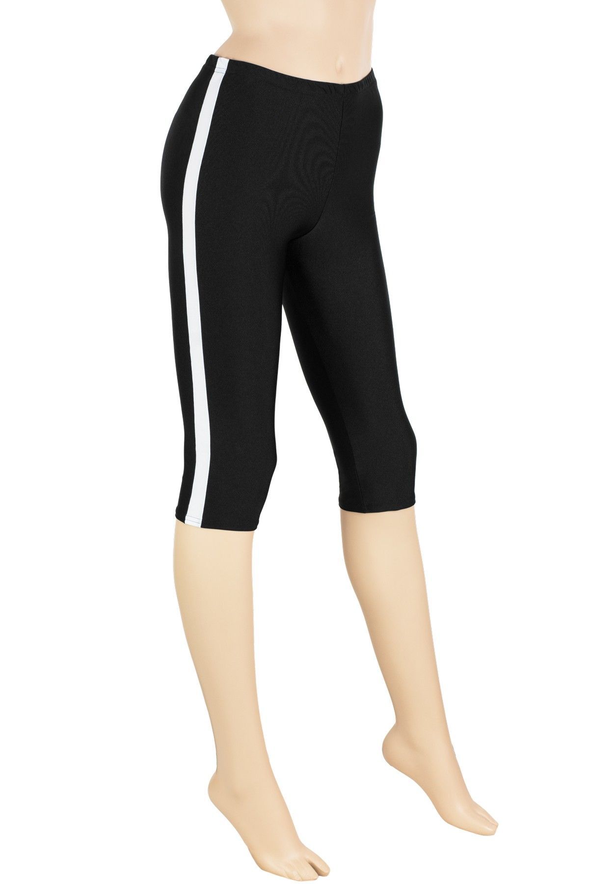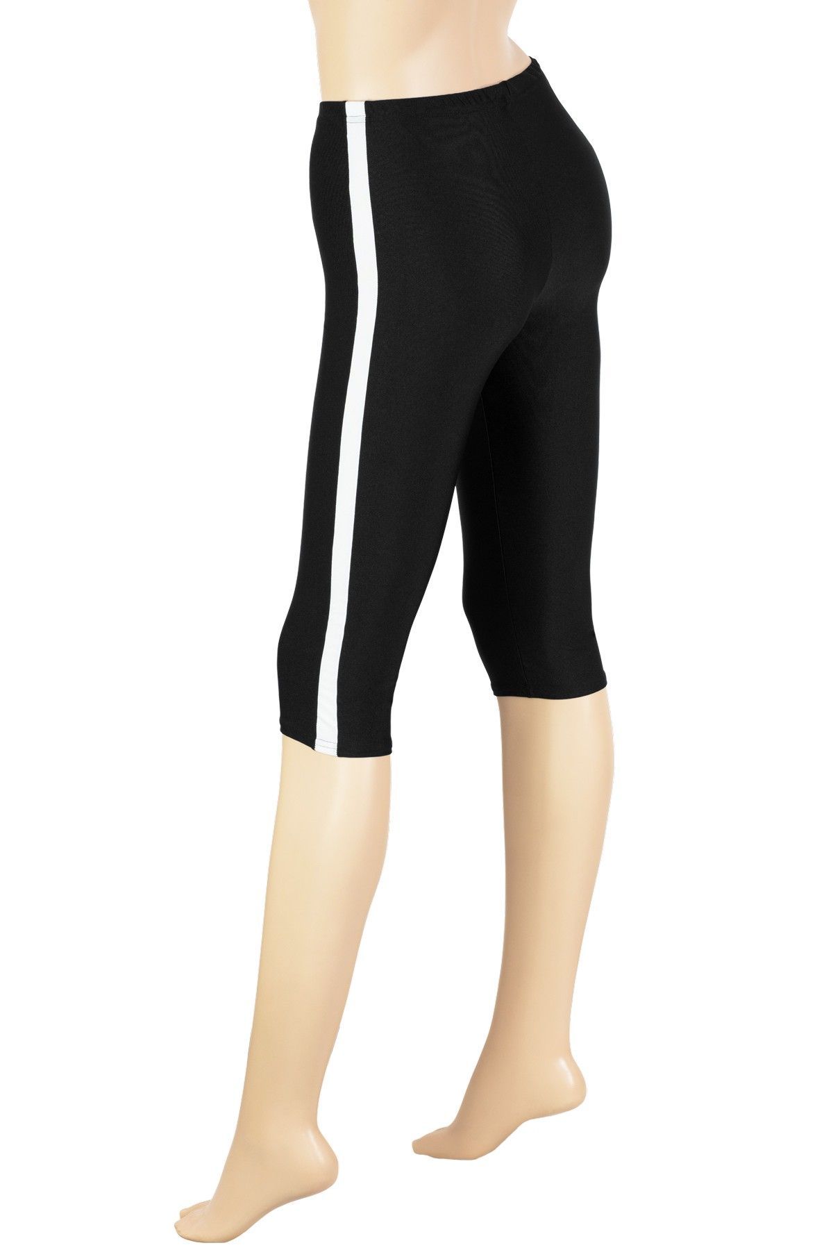 Damen Caprihose mit weißen Galonstreifen aus 80% Polyamid, 20% Elasthan. 3/4 lange Sporthose, hoch elastisch und glänzend. Made in Germany, by us - ML-Sport24!