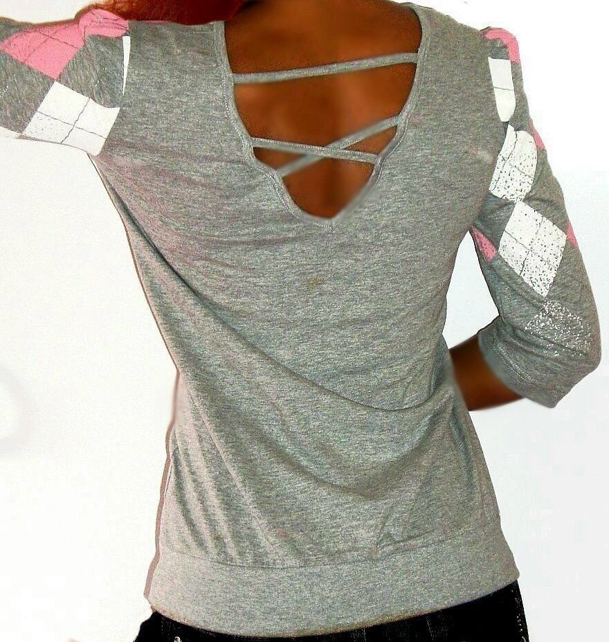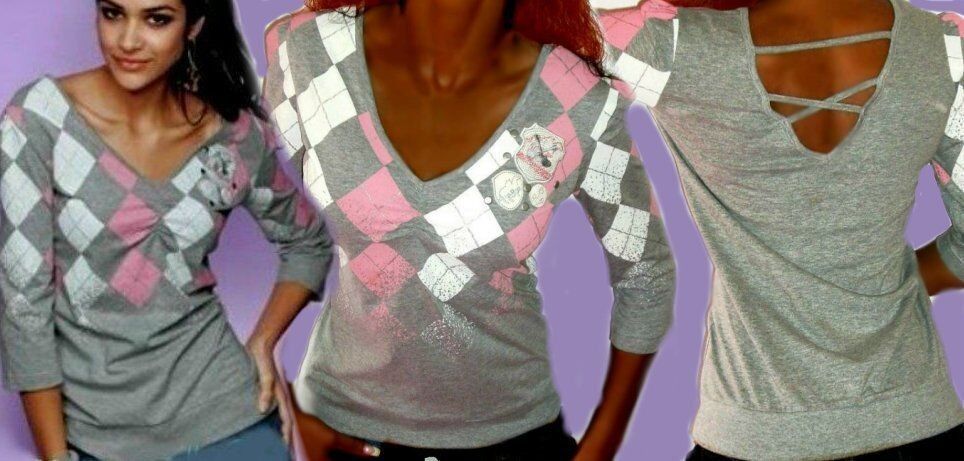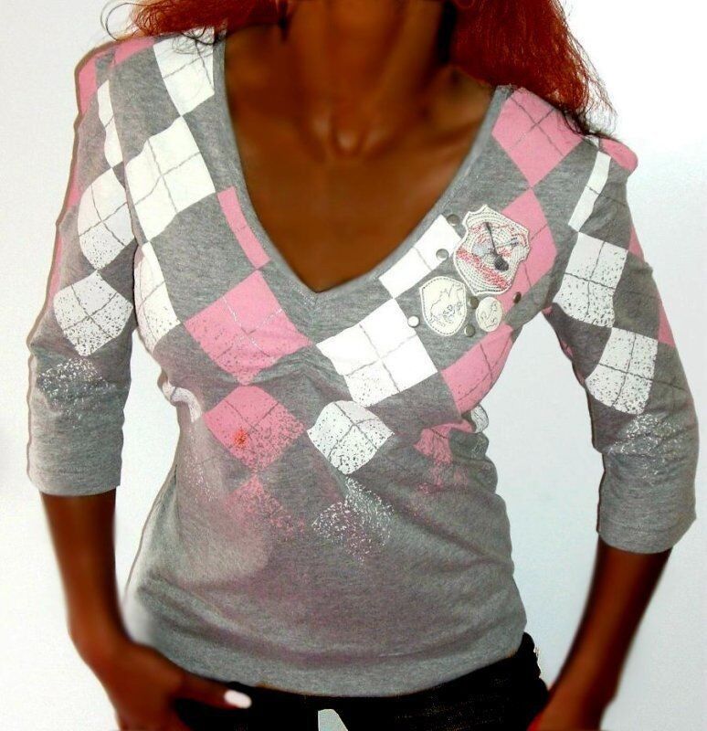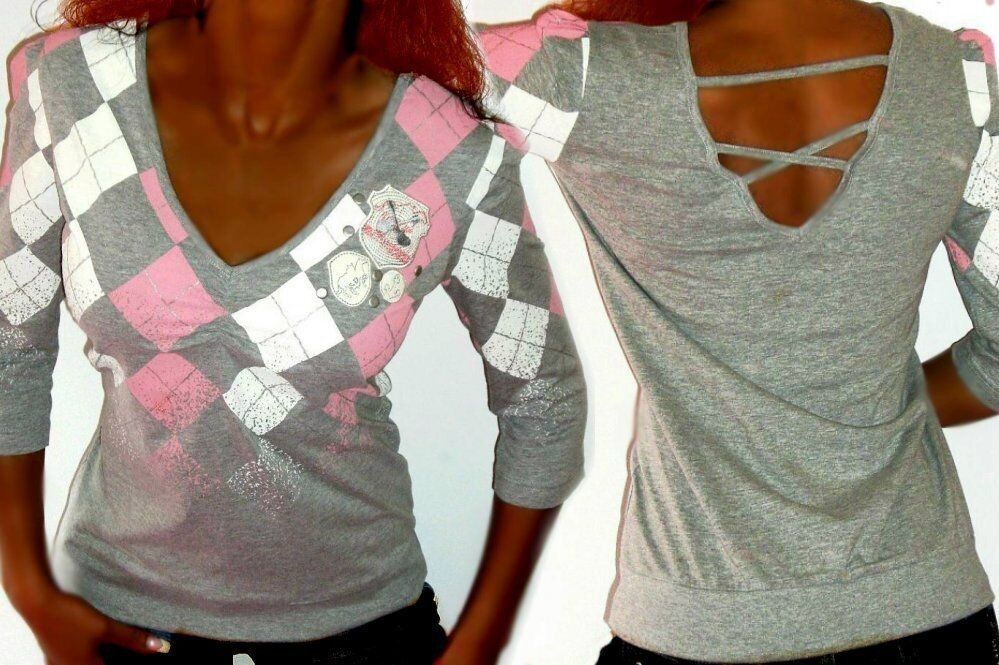 Damen Karo V Shirt Top Langarm Retro Nieten lässig 32/34 XS NEU grau rosa weiß silber