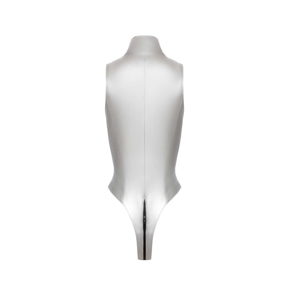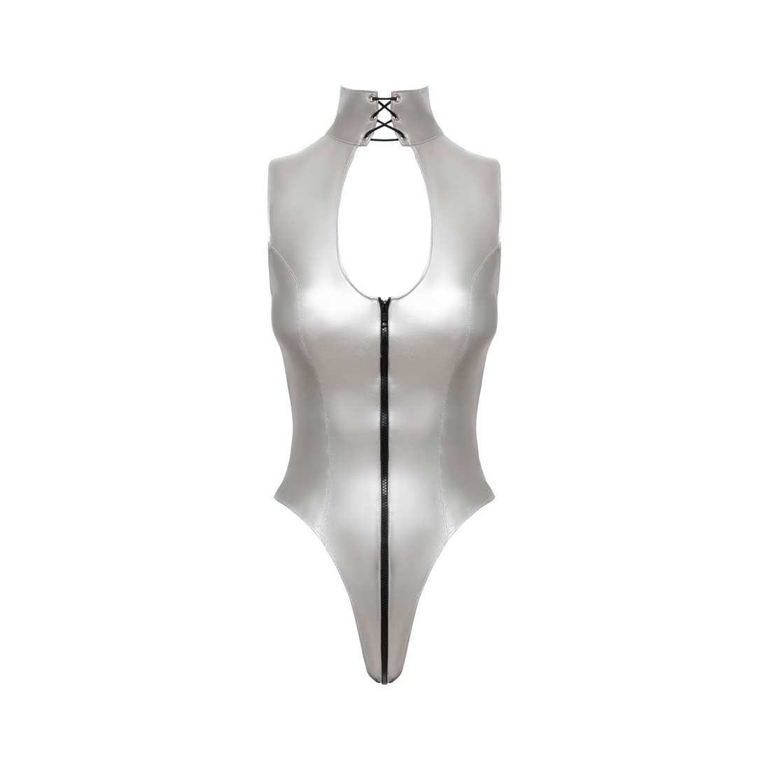 Black Level Damen Lack Body silber S-XL Bodysuit Wetlook Glanz Reißverschluss Party "Frankie