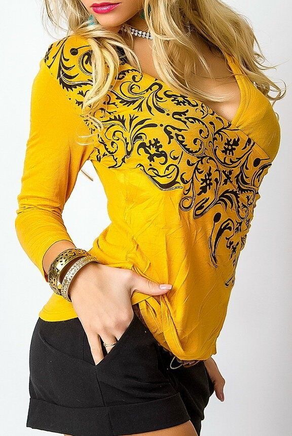 Damen MiSS Girly V Shirt Wickel Look Top Tribal Print curry schwarz gold M/ L 36/38