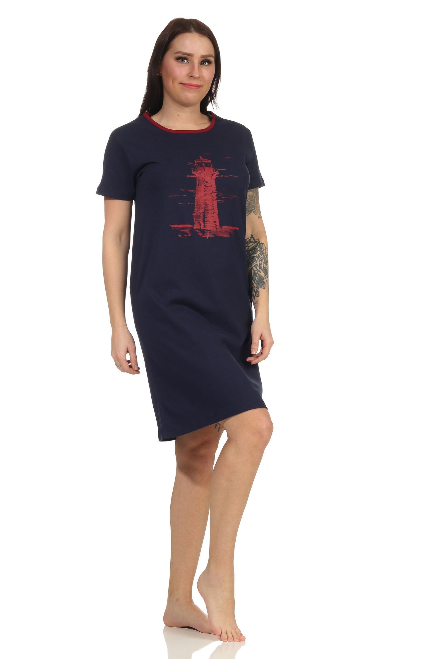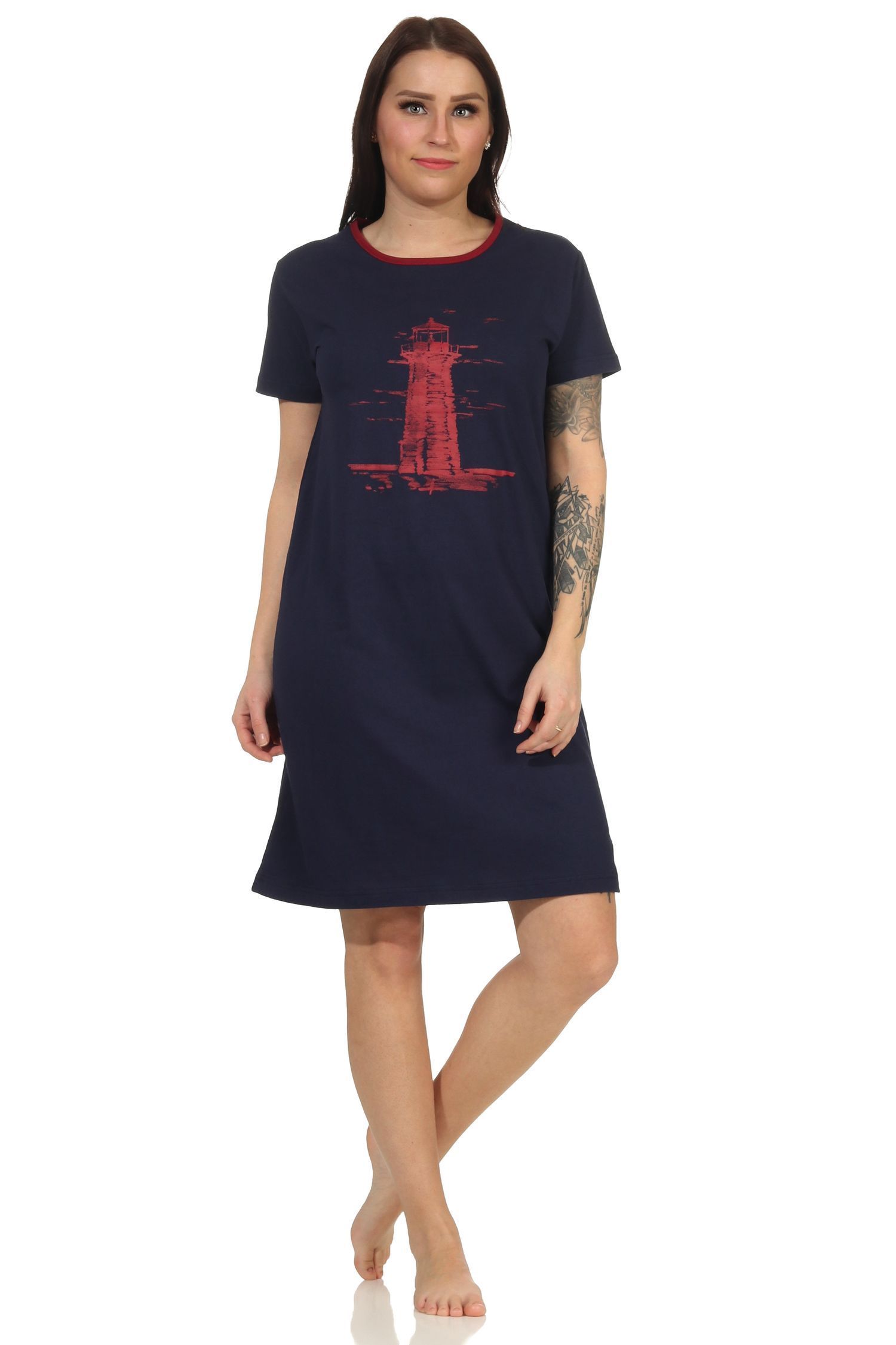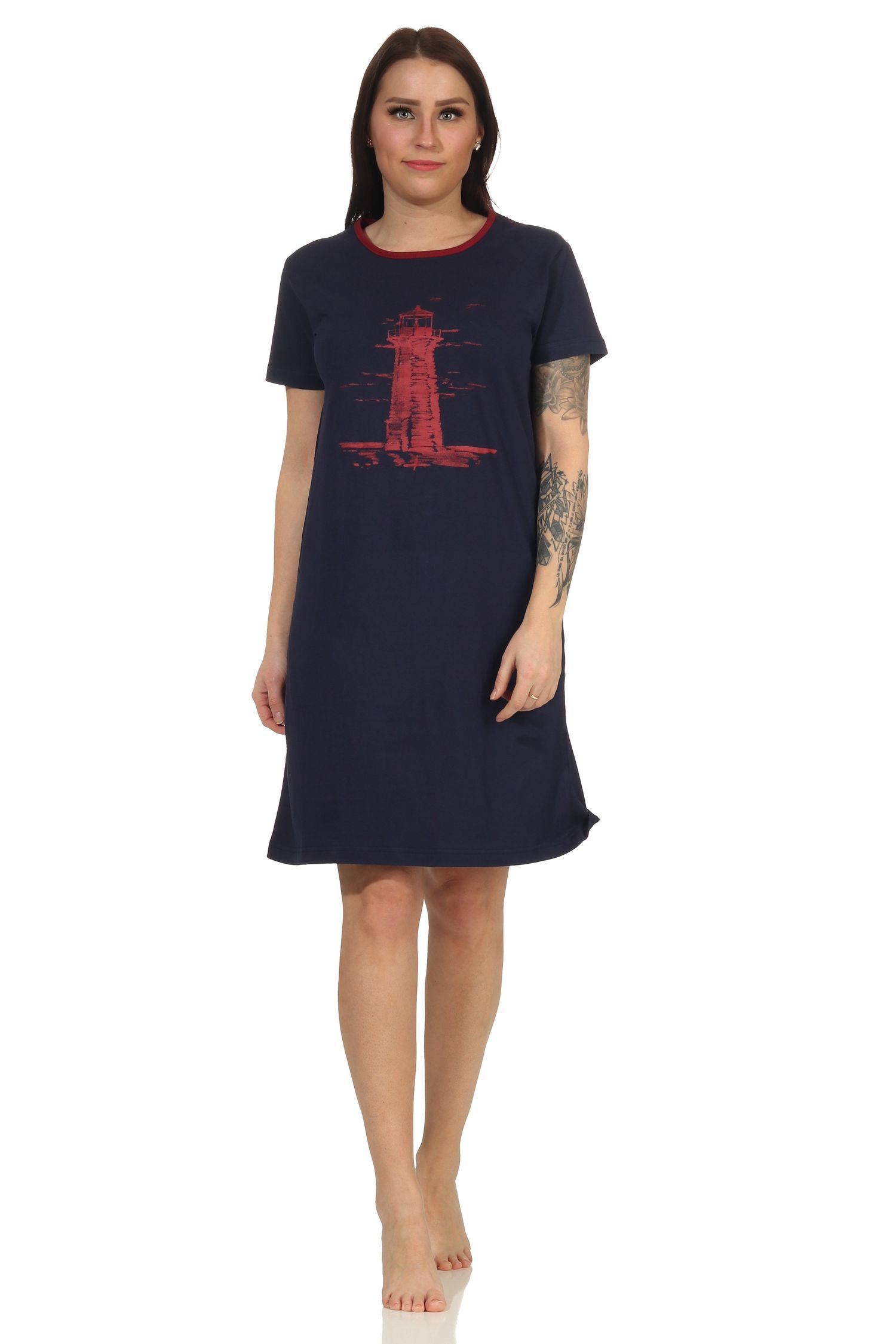 Damen Nachthemd kurzarm im maritimen Look und mit Leuchtturm als Motiv - 715