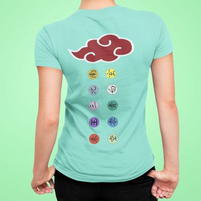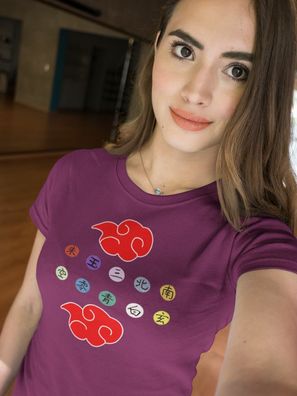 • Naruto Akatsuki Logo Rote Wolken und Ring Zeichen Symbole Anime T-Shirt Damen