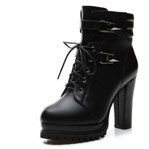 Damen Punk Schuhe Plateau Schnurung Block High Heels Schnalle Reibverschluss Stiefele