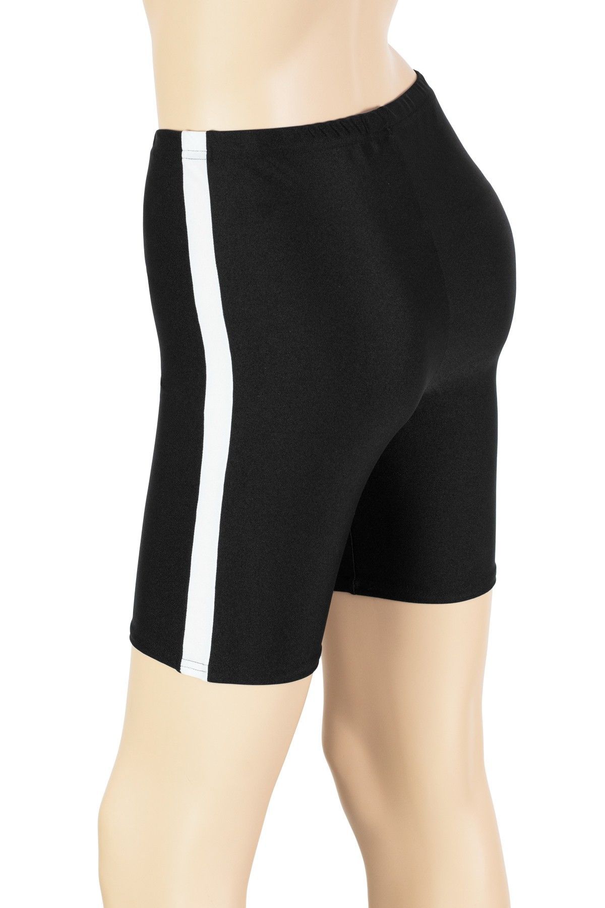 Damen Radler mit weißen Galonstreifen aus 80% Polyamid, 20% Elasthan. Kurze Sporthose, hoch elastisch und glänzend. Farbe: schwarz. Ohne Sitzpolster. Made in Germany, by us - ML-Sport24!