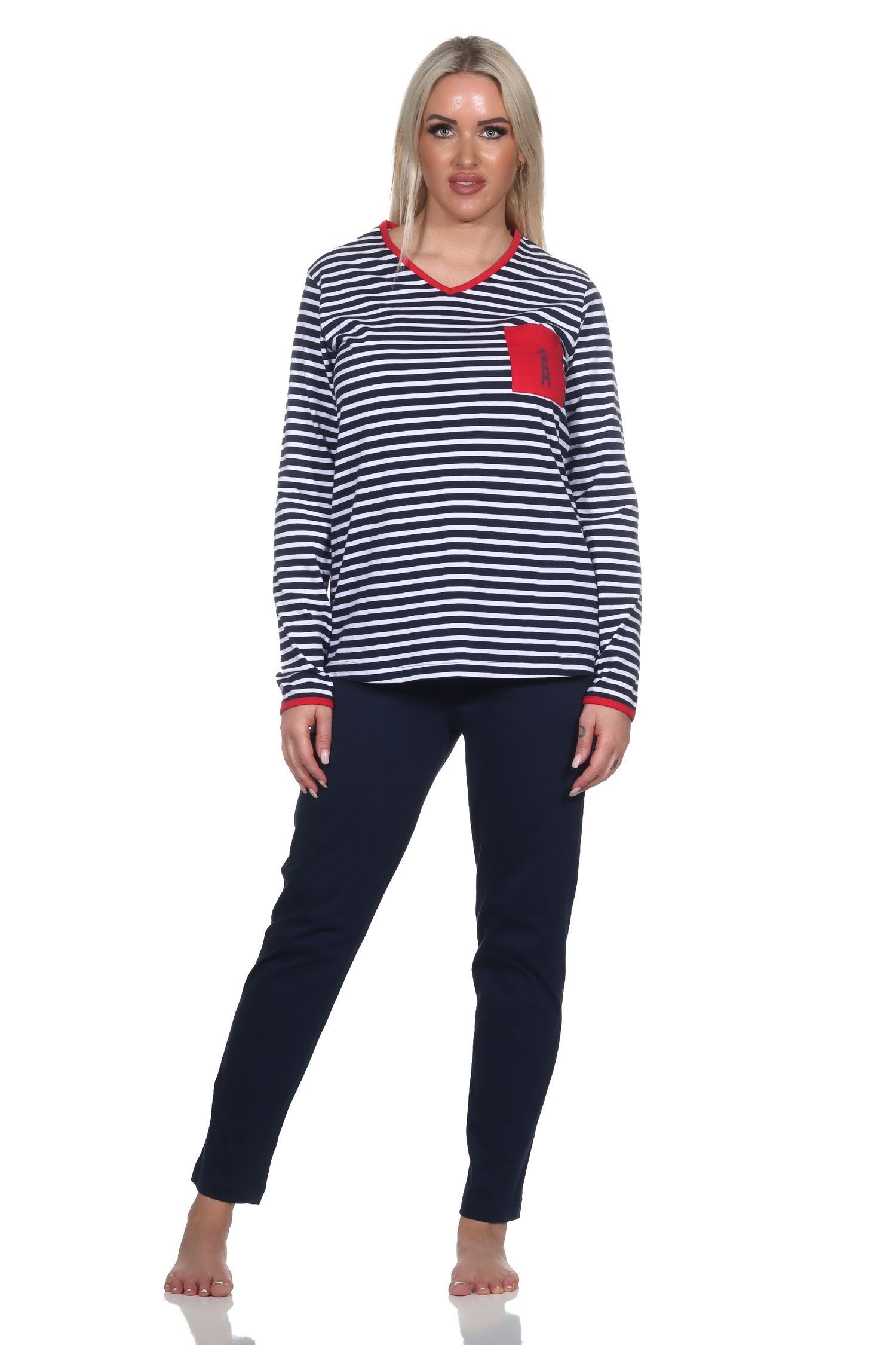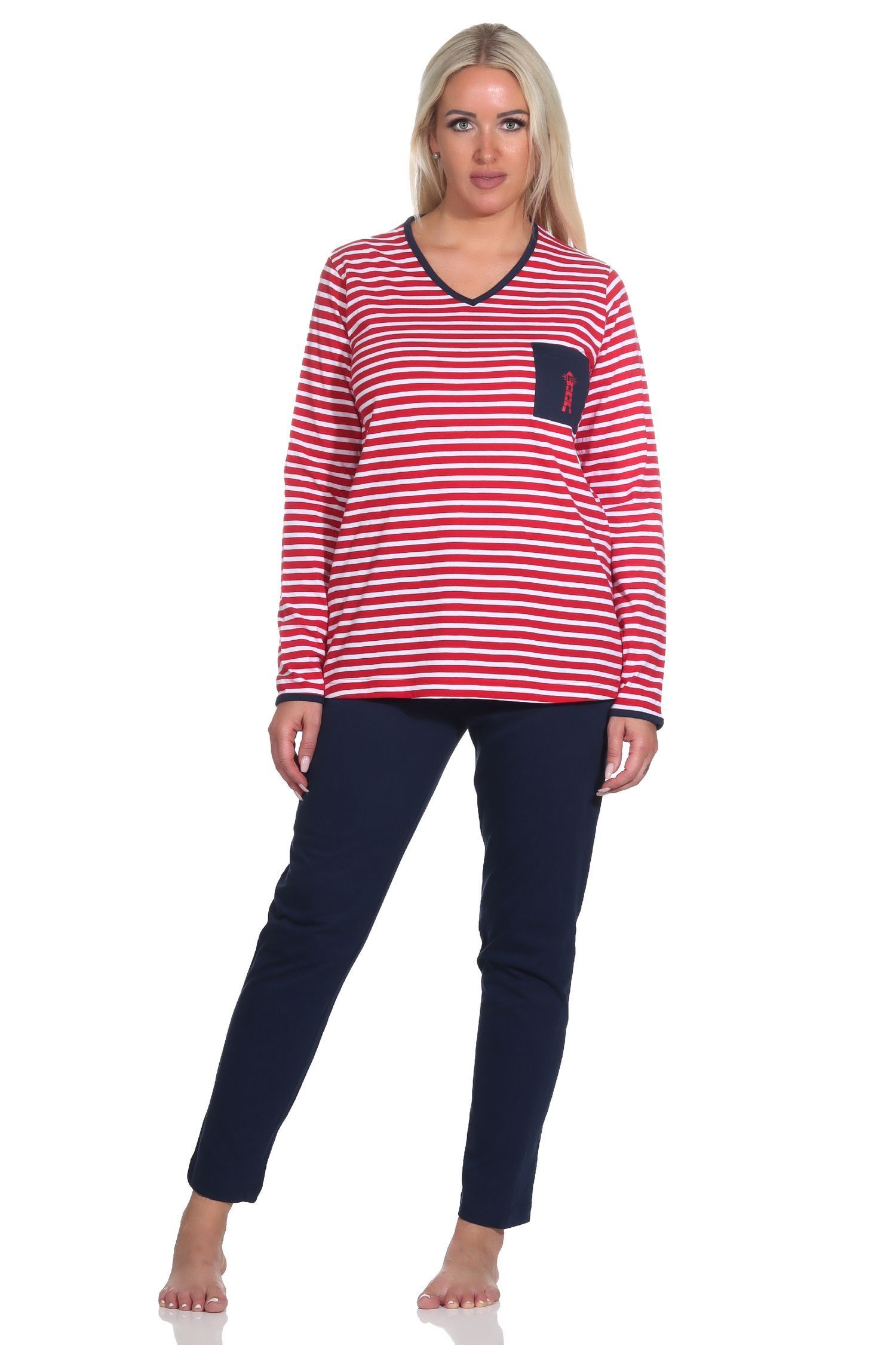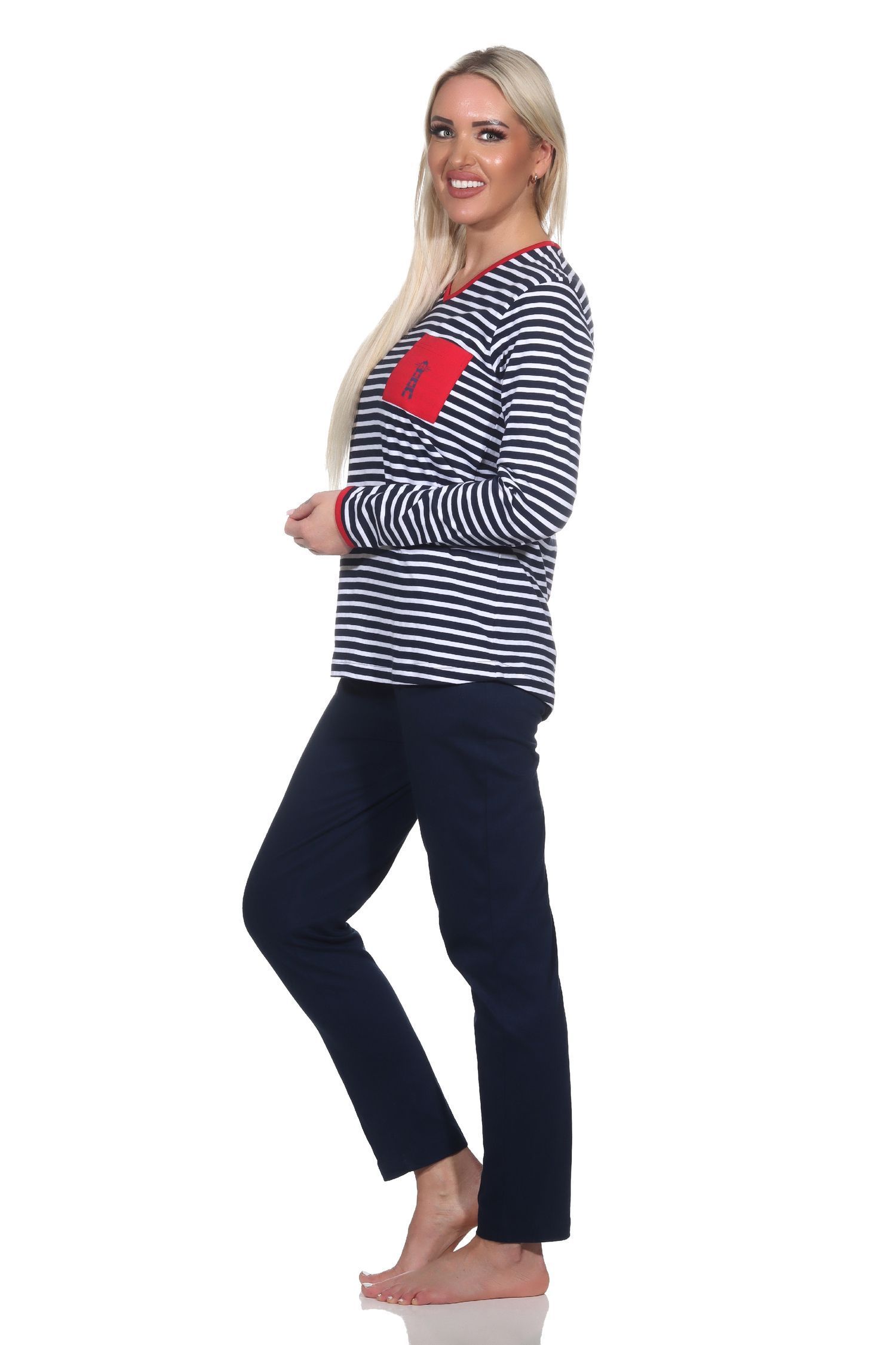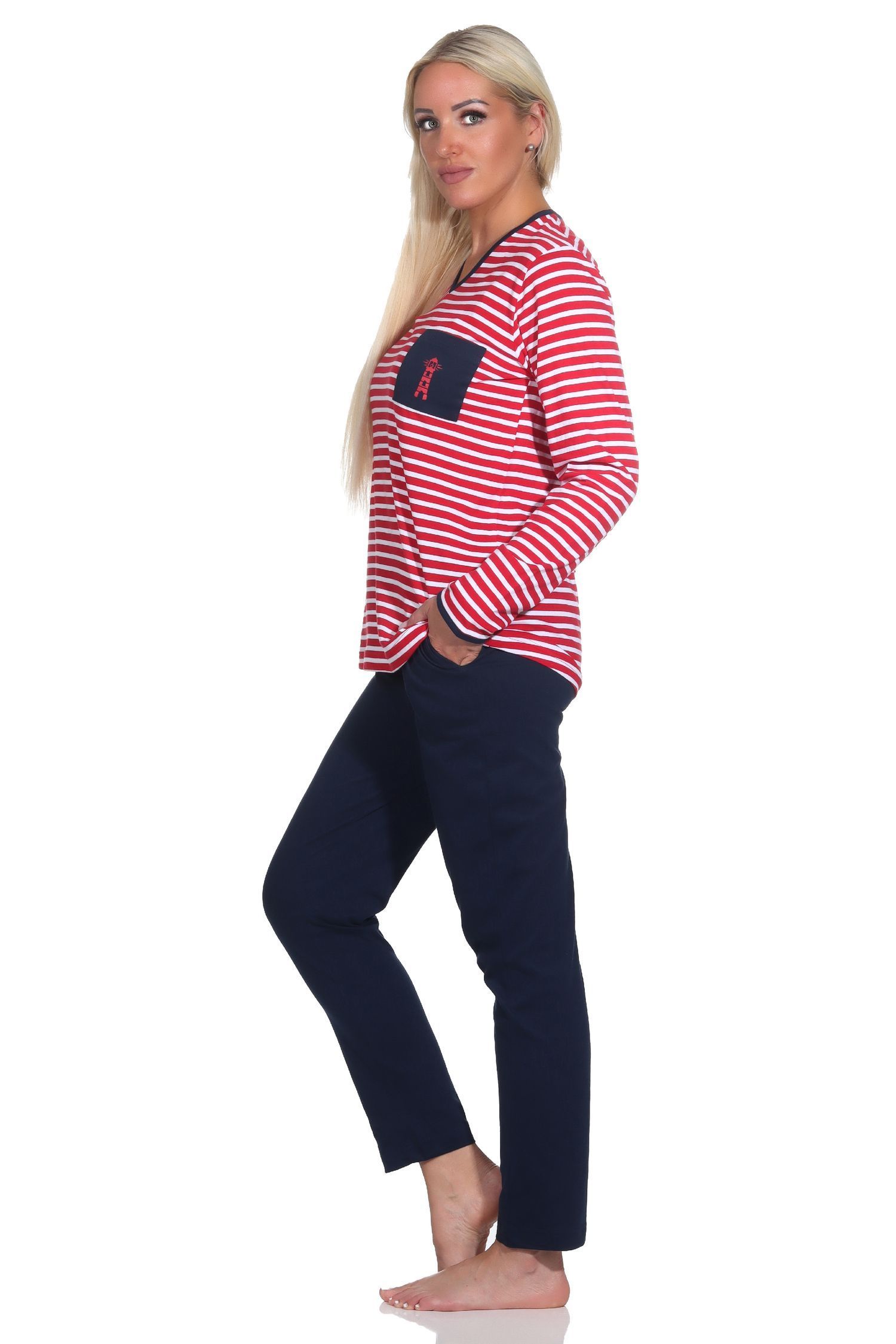 NORMANN Damen Schlafanzug in maritimer Streifenoptik und Leuchtturm Motiv