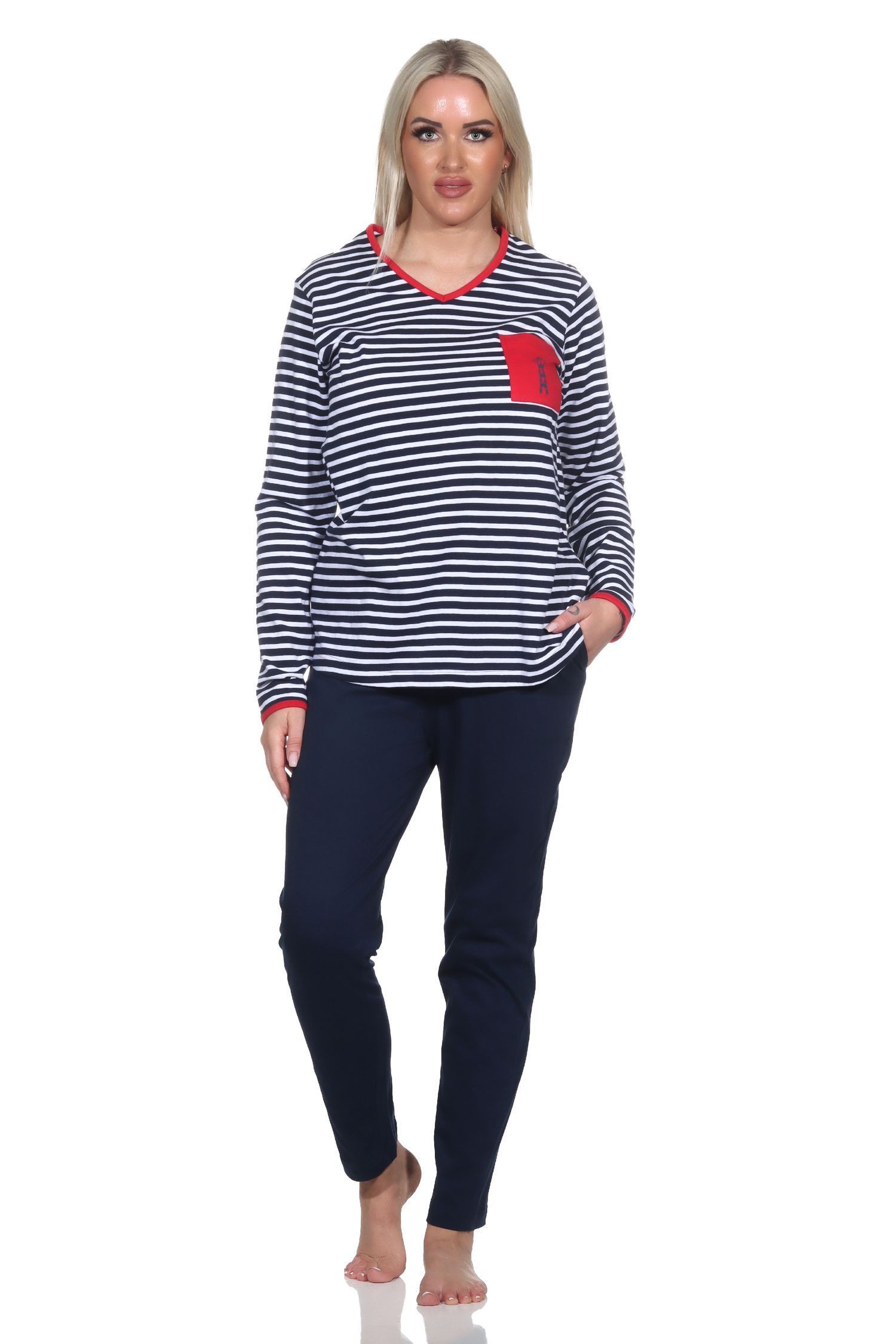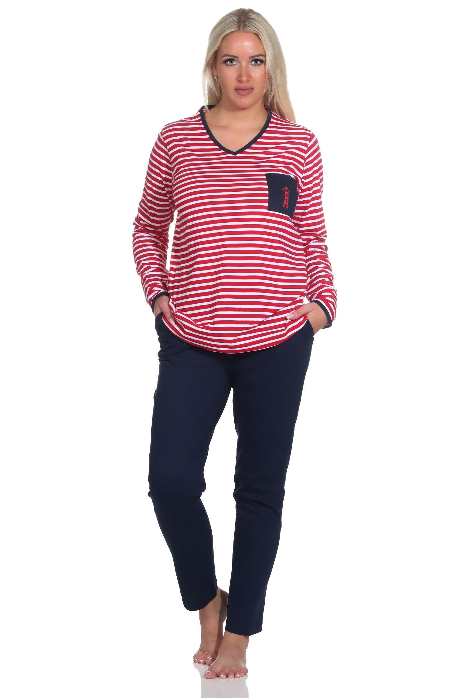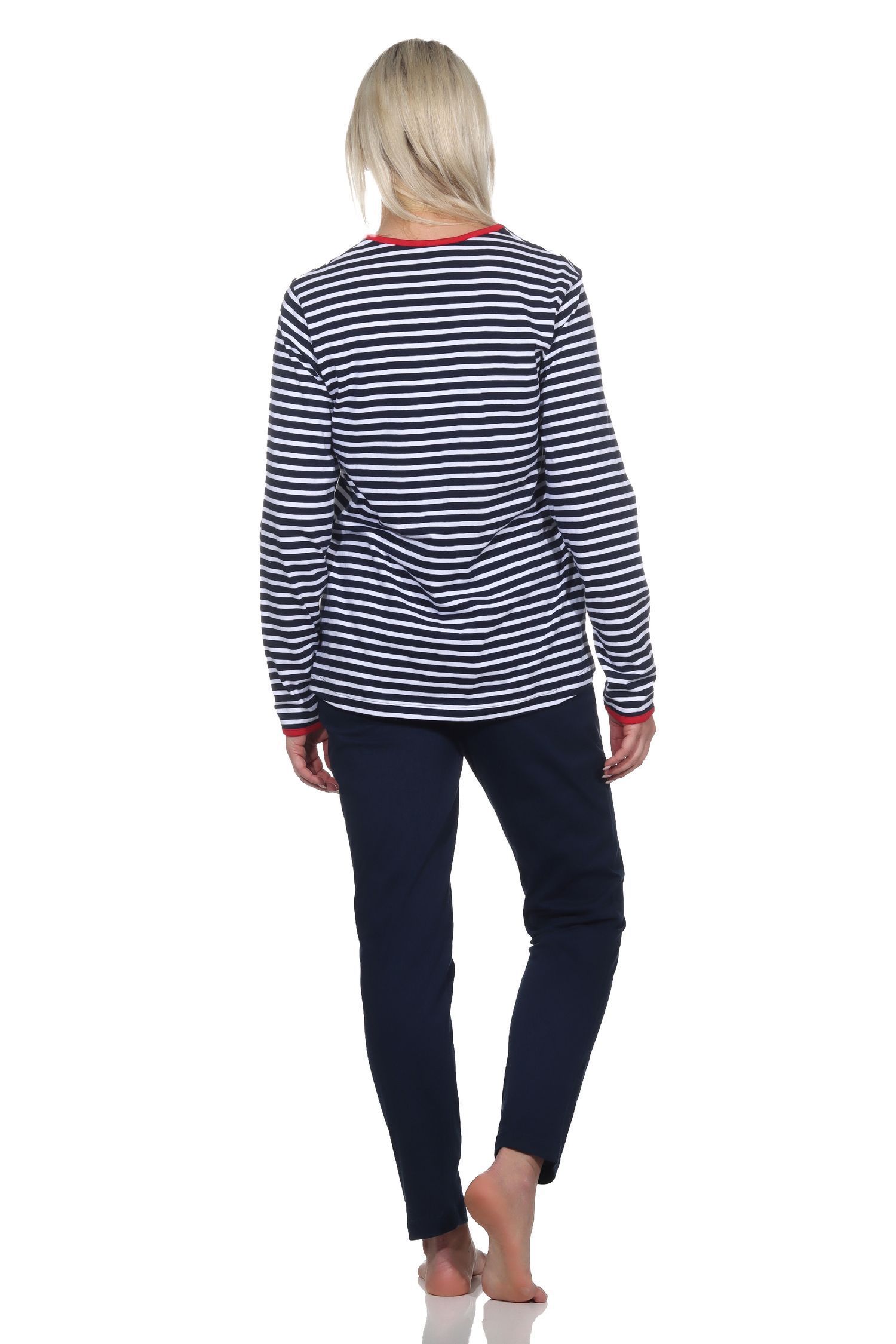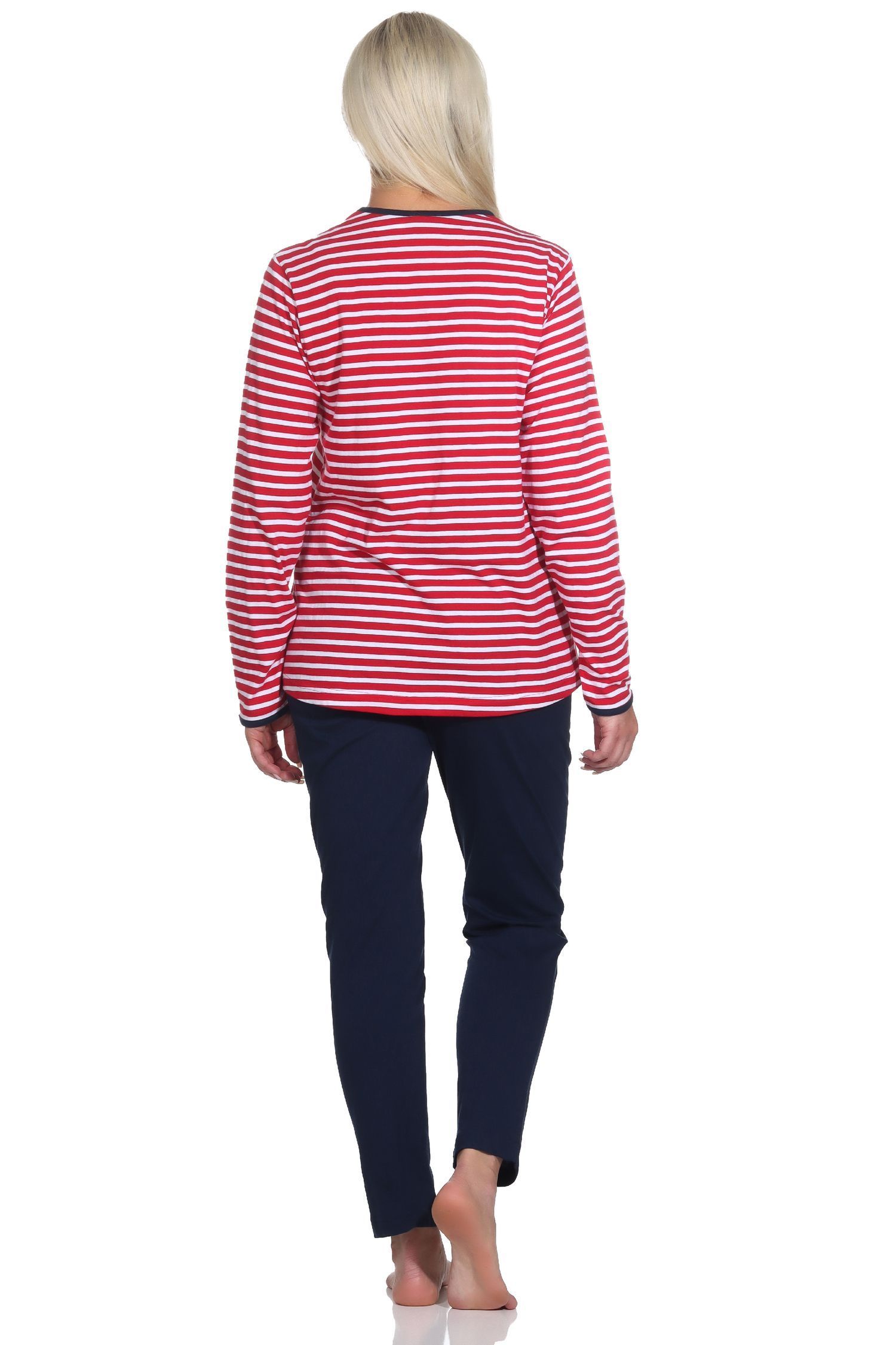 NORMANN Damen Schlafanzug in maritimer Streifenoptik und Leuchtturm Motiv
