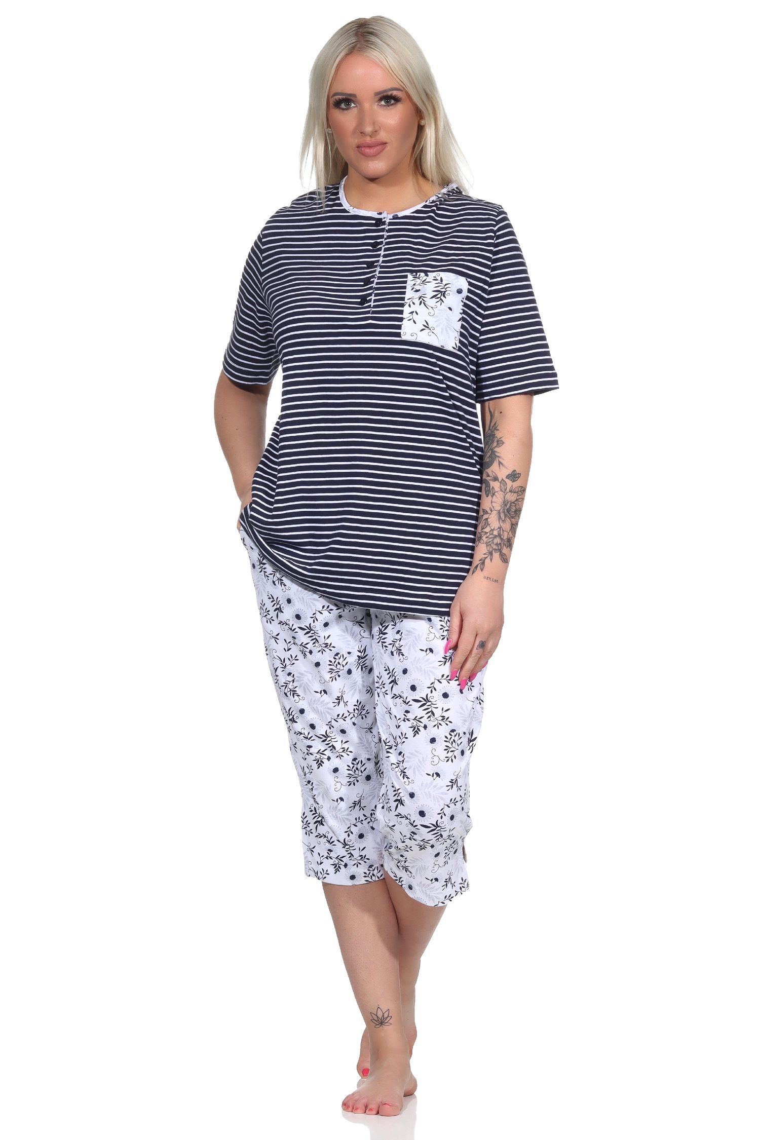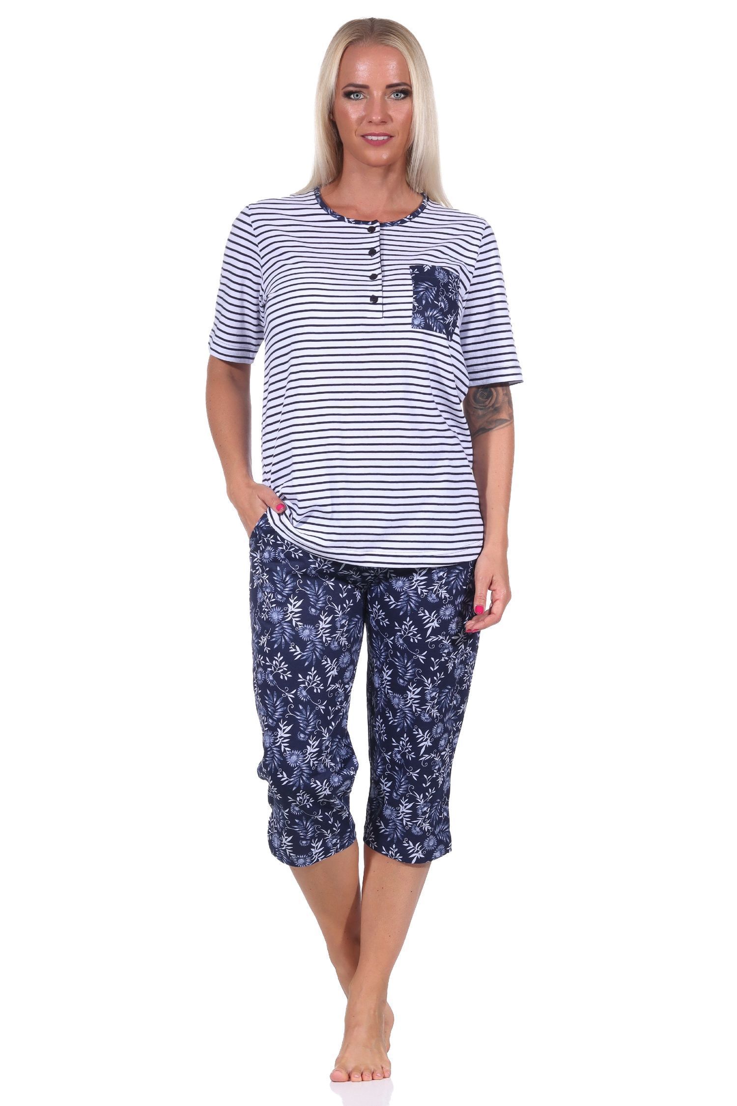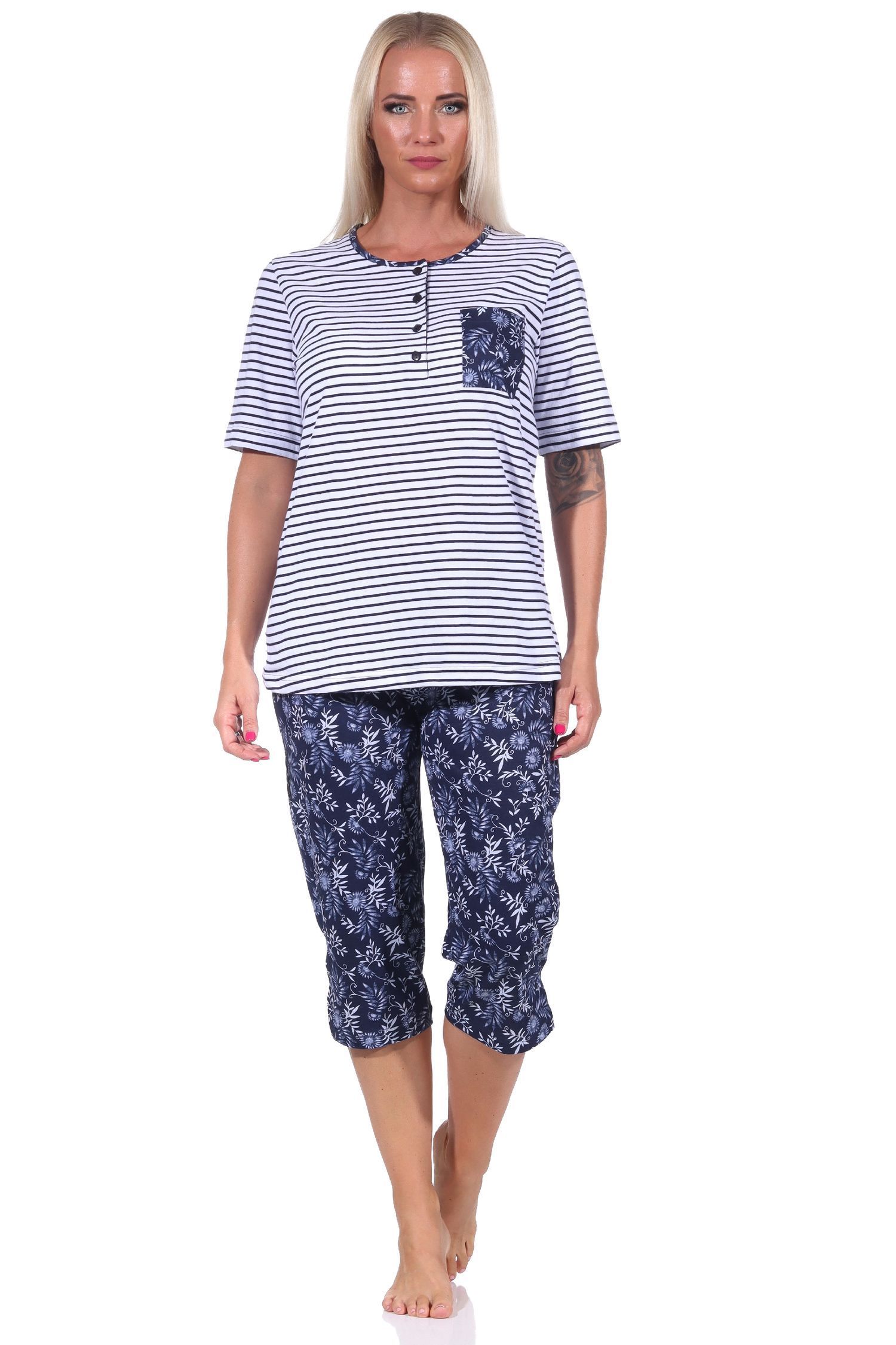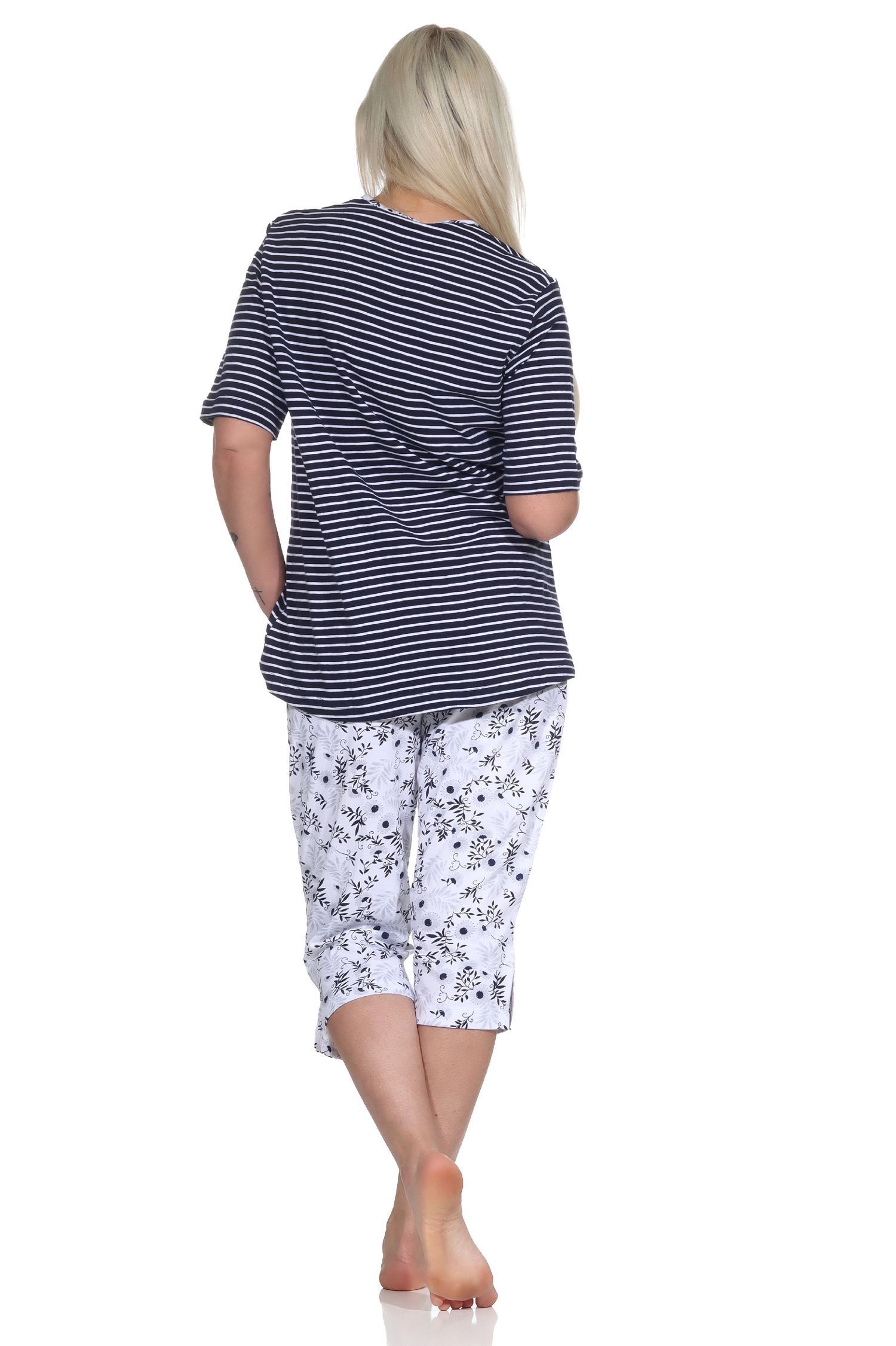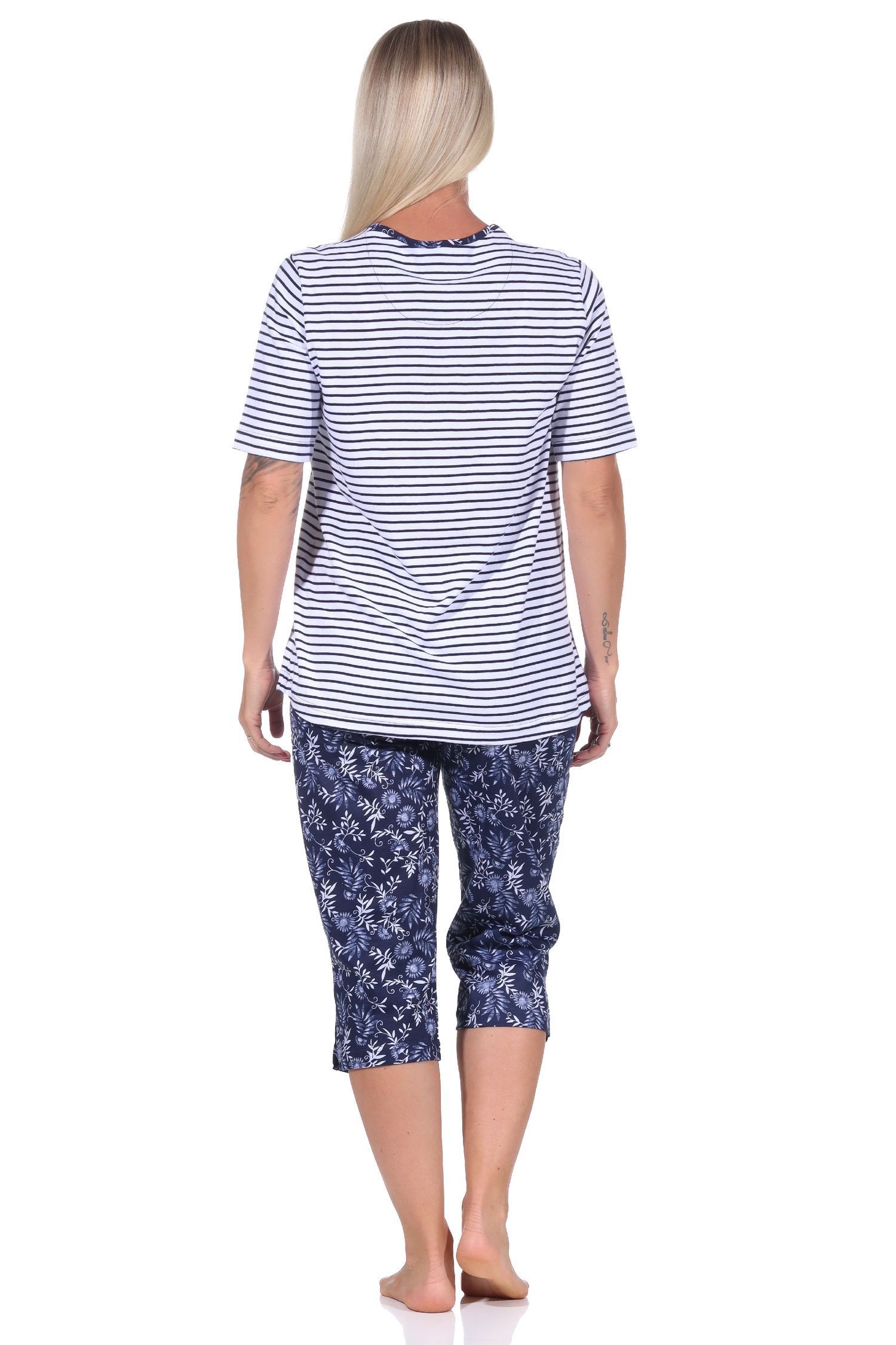 Damen Schlafanzug Pyjama kurzarm, Oberteil gestreift, Capri Hose mit Blümchenmuster