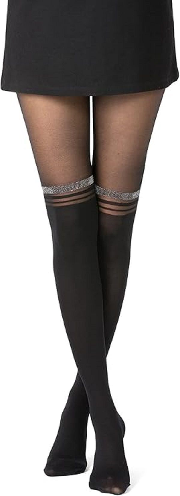 Damen Strumpfhose mit Overknees Effekt und Streifen länglich Glitzer