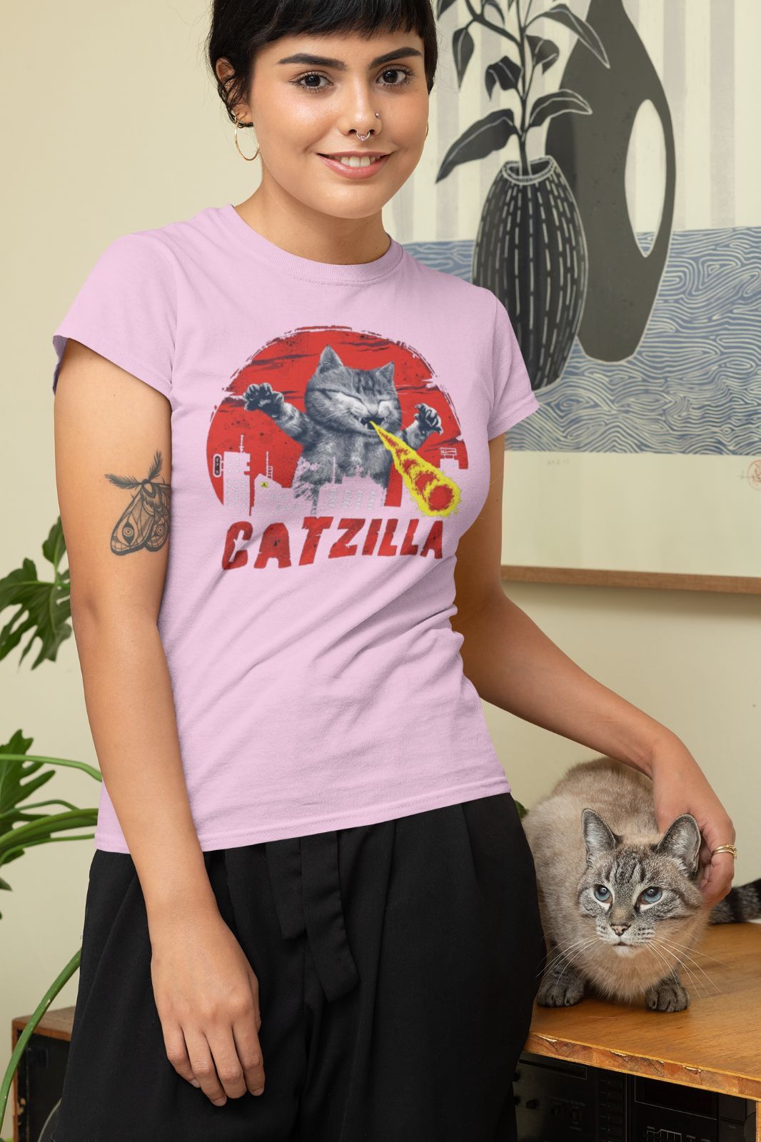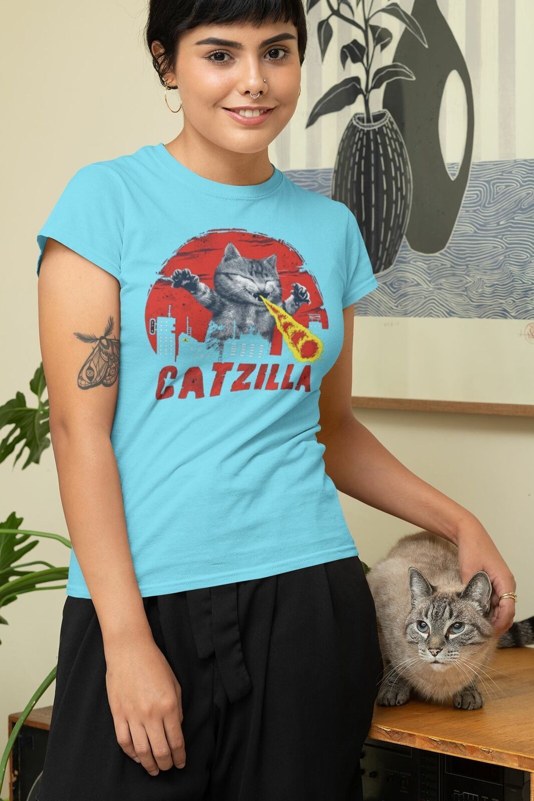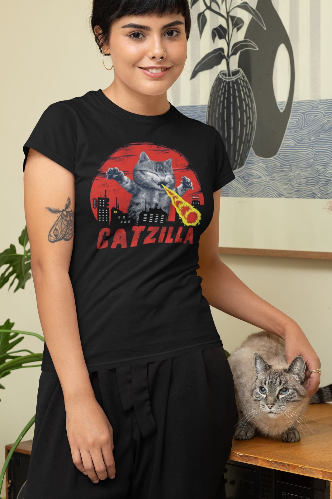 Damen T-Shirt Catzilla Katzen Katzenbesitzer Tiere Cat Witzig Lustig Geschenk