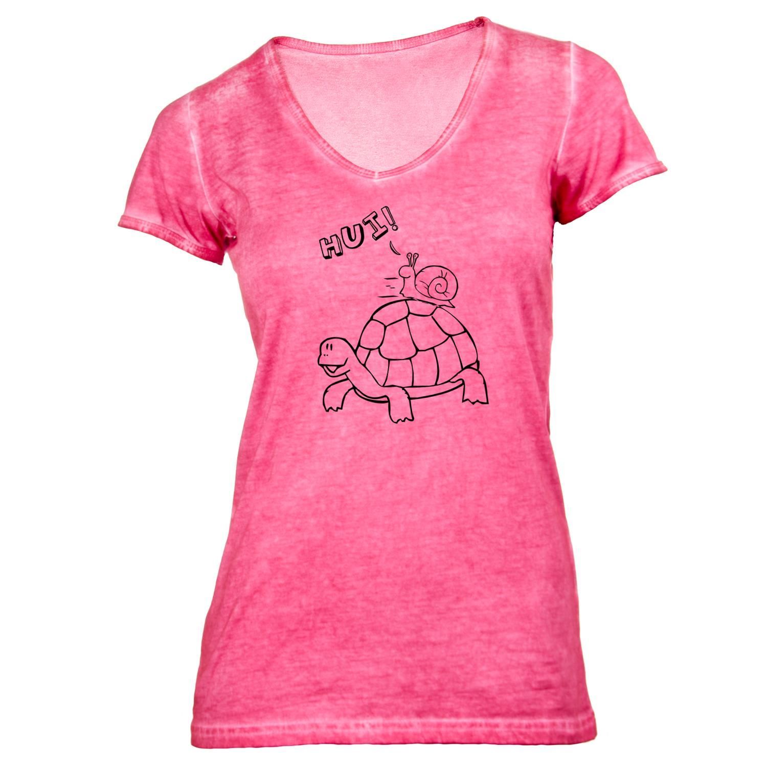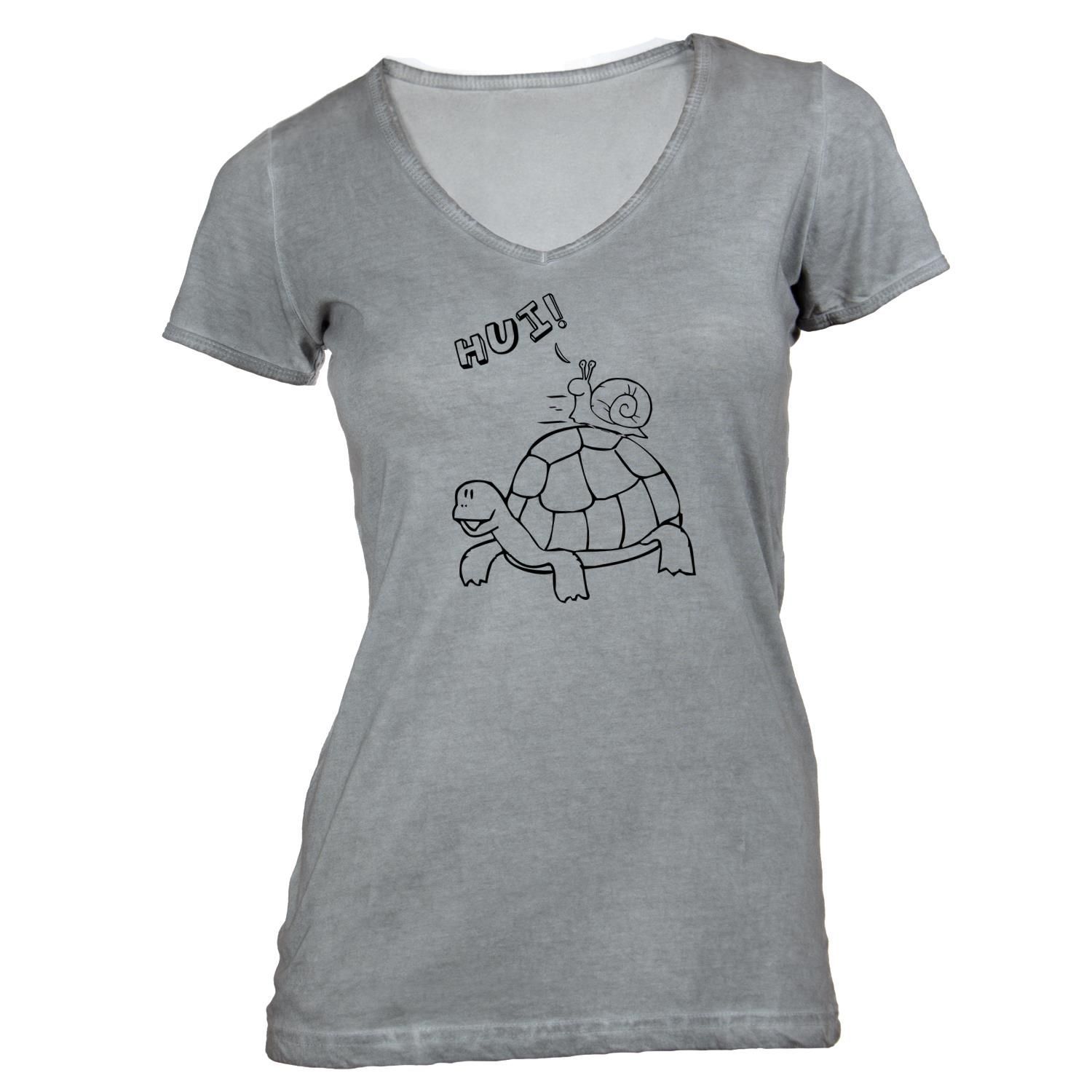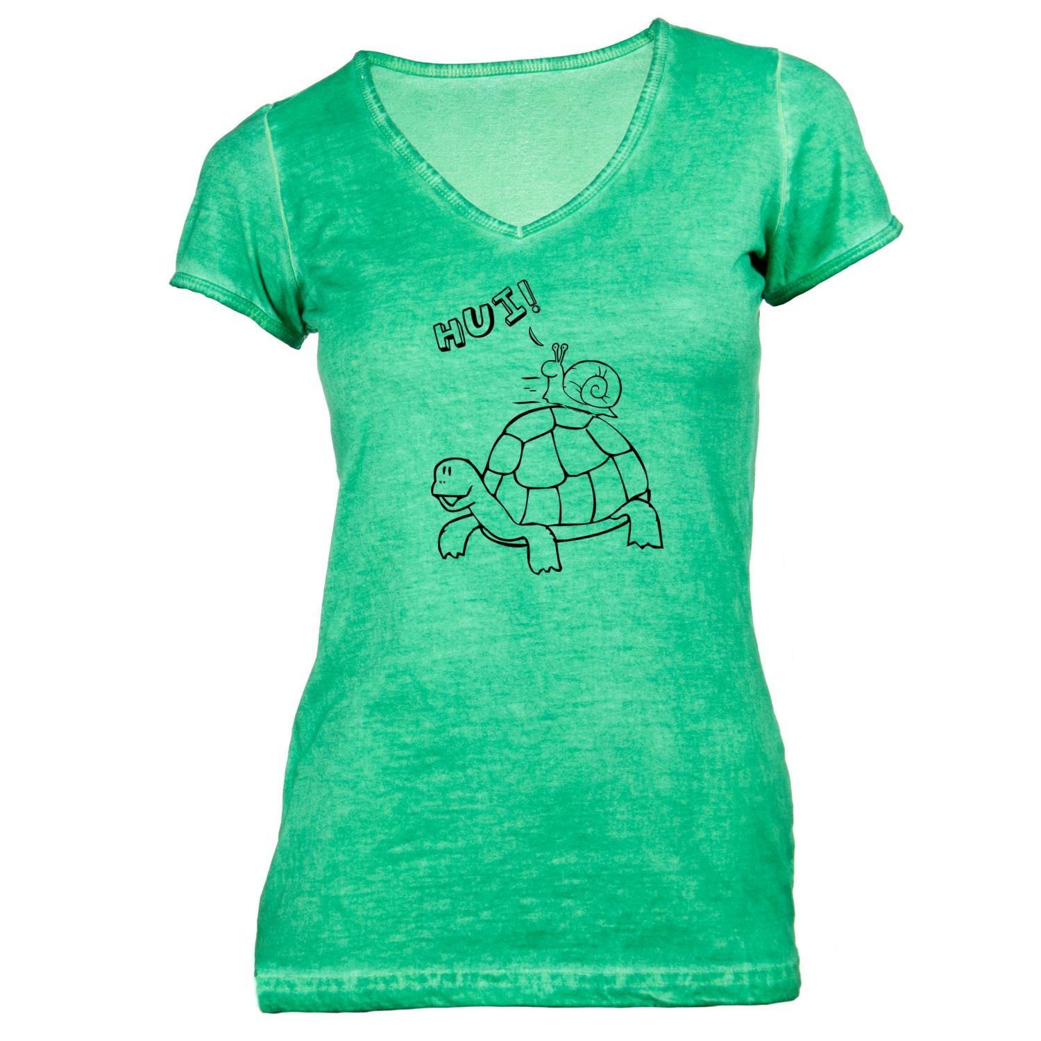 Damen T-Shirt V-Ausschnitt Schildkröte Schnecke hui