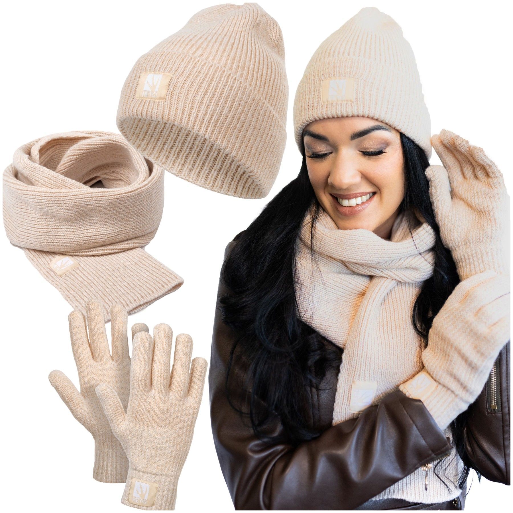 Damen Winter-Set Strickmütze mit Umschlag, Schal Handschuhe Warme Beanie Strickschal