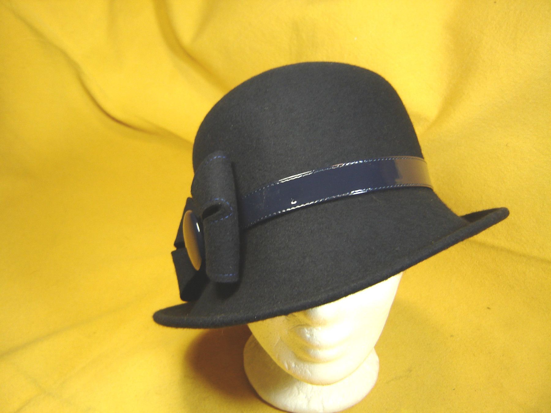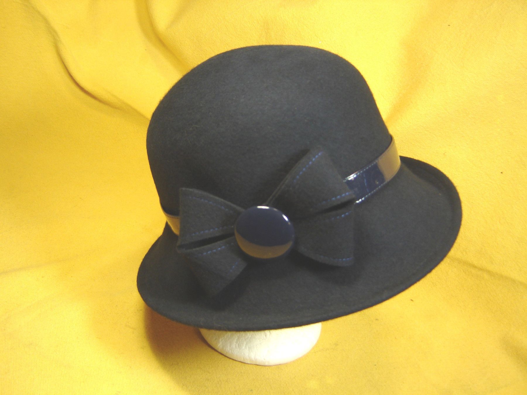 Damenhut asymetrisch Form Wollfilz dunkelblau mit Lackband und Schleife