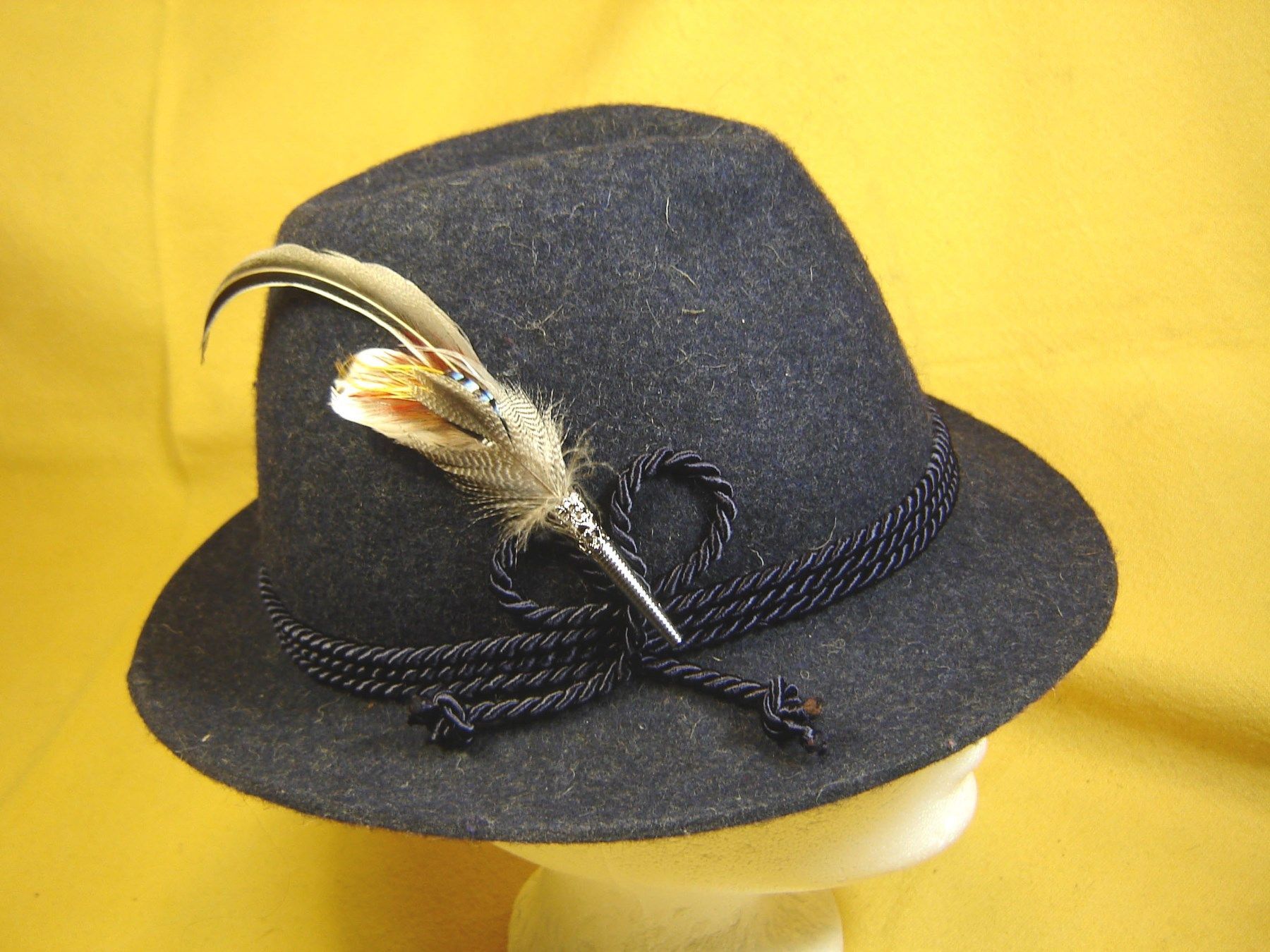 . klassischer Trachtenhut aus festem Wollfilz handgearbeitet klassische Trachtenhut Form , wetterfest !! in Farbe dunkelblau meliert als Garnitur 3x dunkelblaue seidige Kordel und dazu ein Federgesteck in Größe 55 cm Kopfumfang . - Bitte sehen Sie sich hier alle meine anderen Artikel an . . Hut Hüte