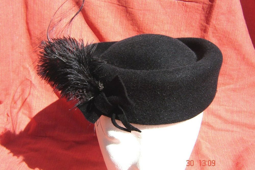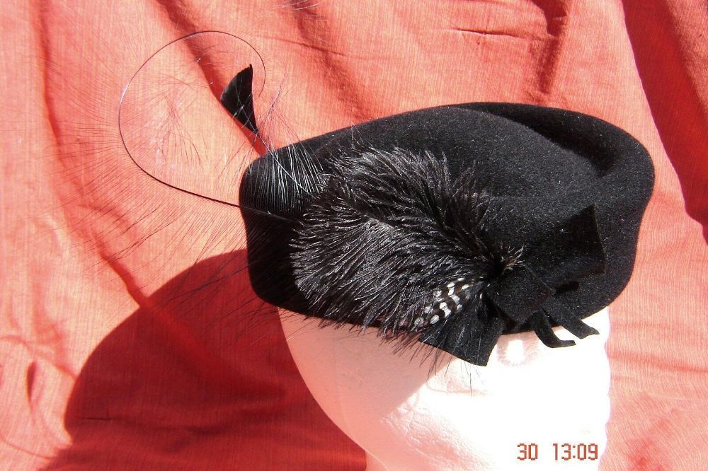 Damenhut klassische Pillbox schwarz mit Federgesteck Handarbeit Trauer Abendgala p