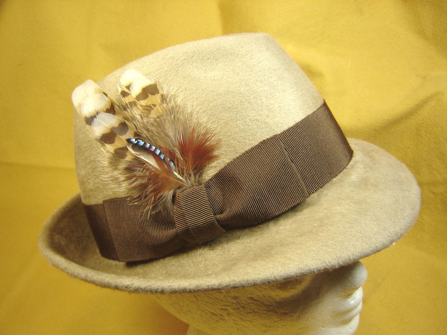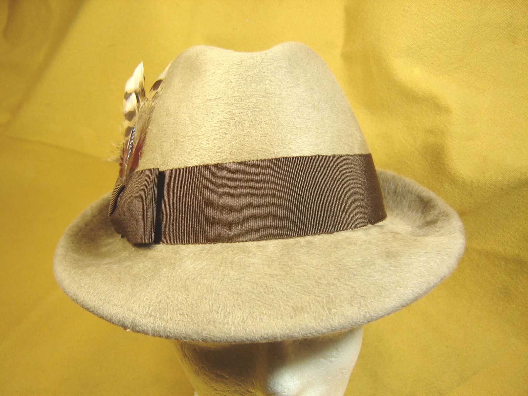 . klassischer Trachtenhut aus Velour 100%Haarfilz wunderschöne Qualität , handgearbeitet klassischer kleiner Trachtenhut klassische Form mit hinten aufgeschlagenem Rand in Farbe beige camel als Garnitur ein ein breites Ripsband mit Schleife in Farbe braun und eine kleine Trachtenfeder Größe wählbar