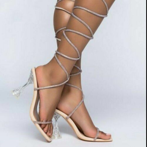 Damenmode Stilettos Gladiator Schuhe Kristall Ferse Lace Up Riemchensandalen