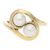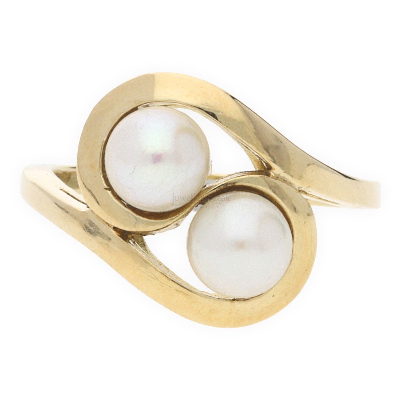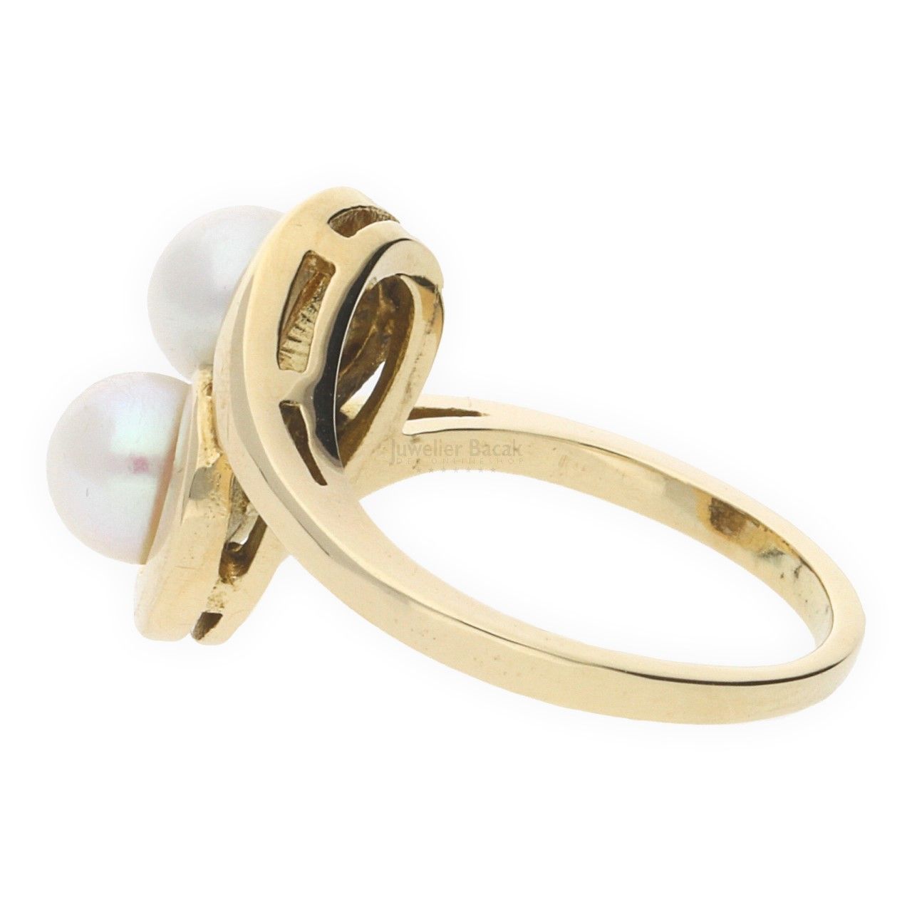 Ein verspielter Ring aus 585 000 14 Karat mit einer glänzend polierten Oberfläche. In der geschwungenen Fassung wurden zwei schimmernde Akoya Zuchtperlen eingearbeitet und lenken alle Blicke auf sich. Die Ringschiene ist relativ schmal gehalten und bildet somit einen sichtbaren Kontrast zum Rest des