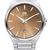 außergewöhnliche Armbanduhr für Männer, mit einem präzisen Quarzwerk, Datumsanzeige, hellbraunes Sunray-Zifferblatt, lumineszierende Zeiger und Stundenpunkte, polierte Indizes, zentraler Sekundenzeiger, mattiertes Edelstahlgehäuse, geriffelte Krone mit Flankenschutz, kratzfestes Saphirglas, Armband aus mattem Edelstahl, Schmetterlings-Faltschließe mit Drücker und Logo, wasserdicht bis 5 bar, Breite (ohne Krone) 40 mm, Höhe 7,5 mm