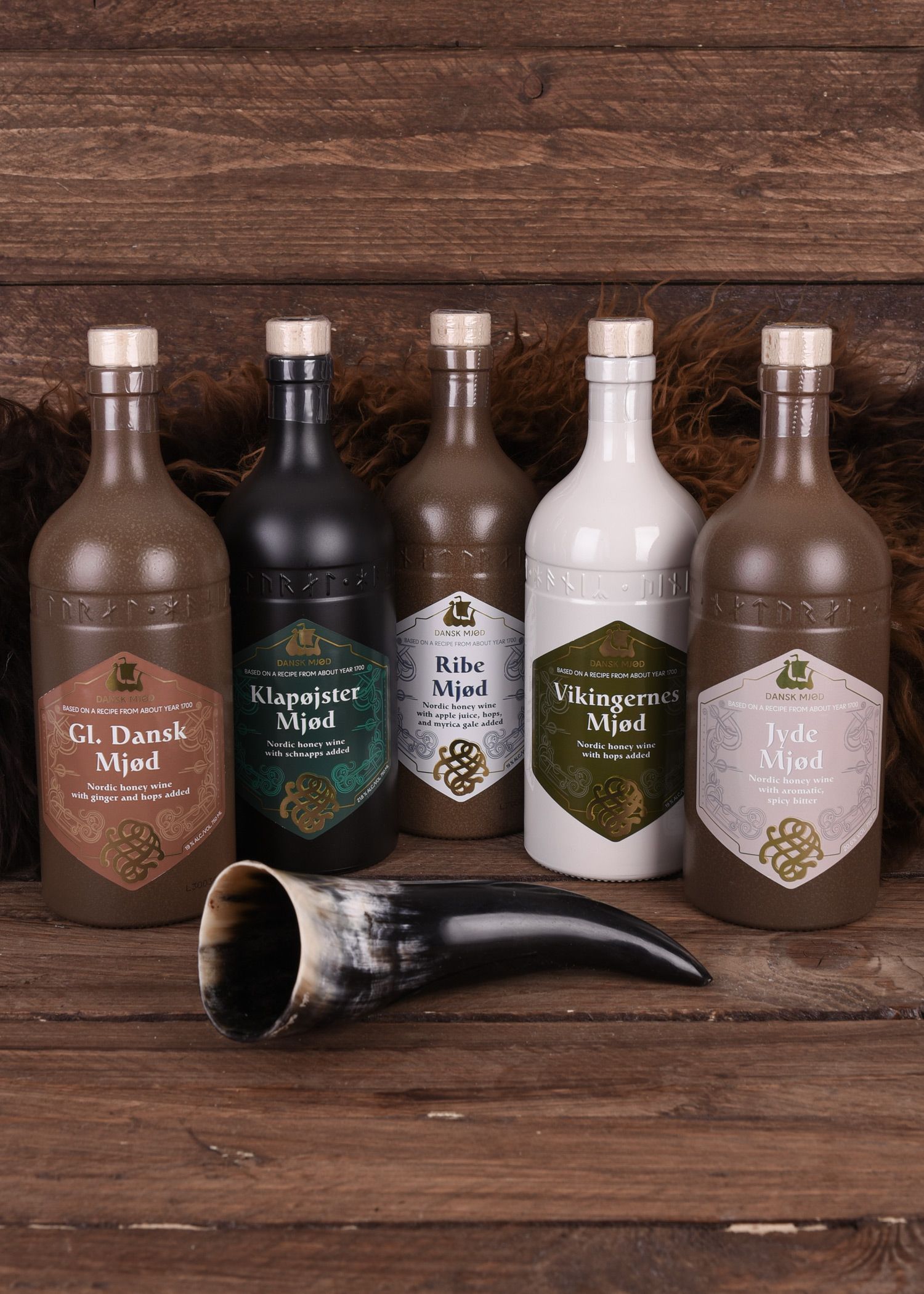 Dansk Mjød - Probierpaket 2 - 5 x 0,75l Met plus Trinkhorn 0,2l Dieses Probierpaket ist perfekt geeignet, um die vielfältigen Met-Sorten von Dansk Mjød kennenzulernen. Stilecht ist ein 200 ml Trinkhorn im Paket enthalten. Dansk Mjød besinnt sich bei seinen Honigweinen auf alte, überlieferte Rezeptur