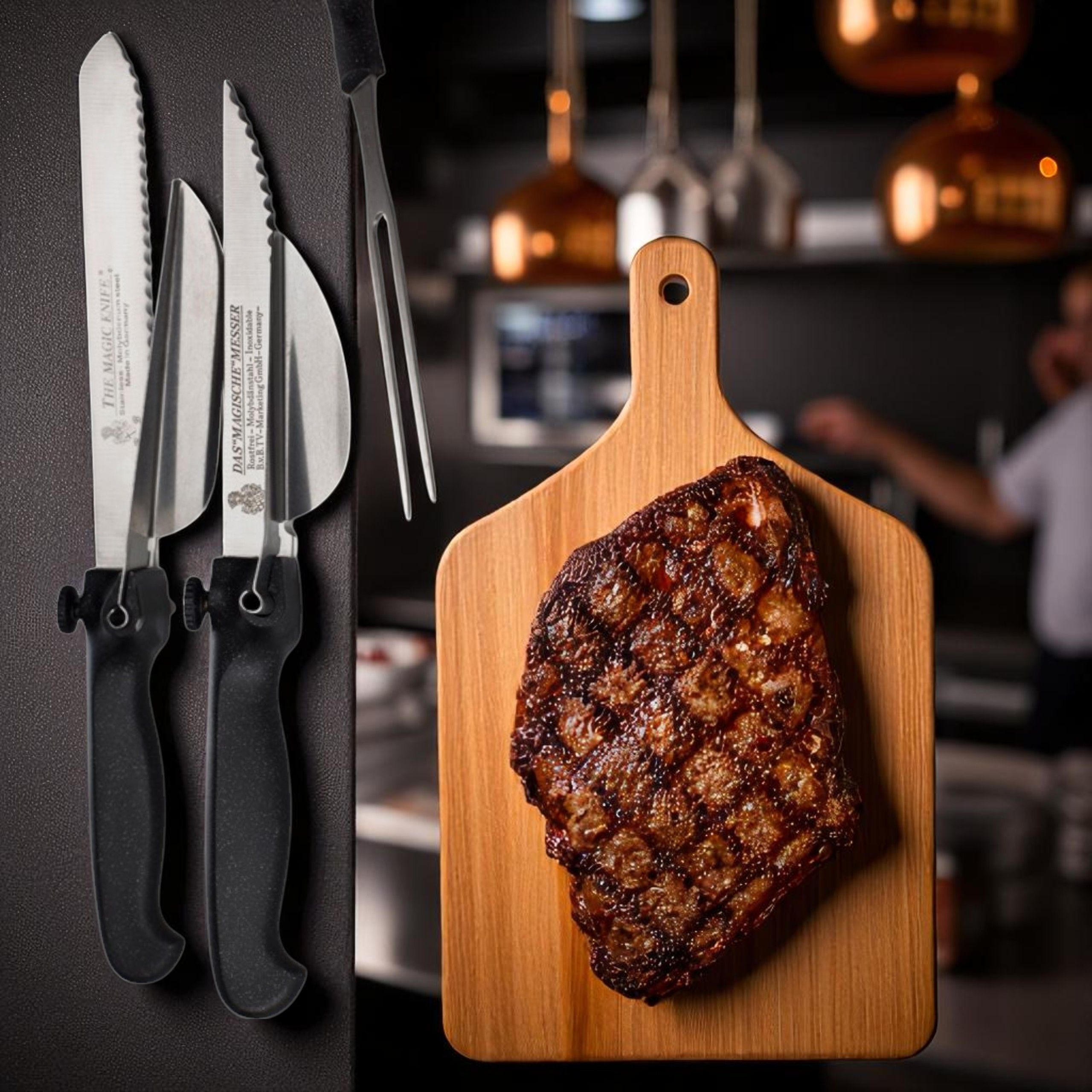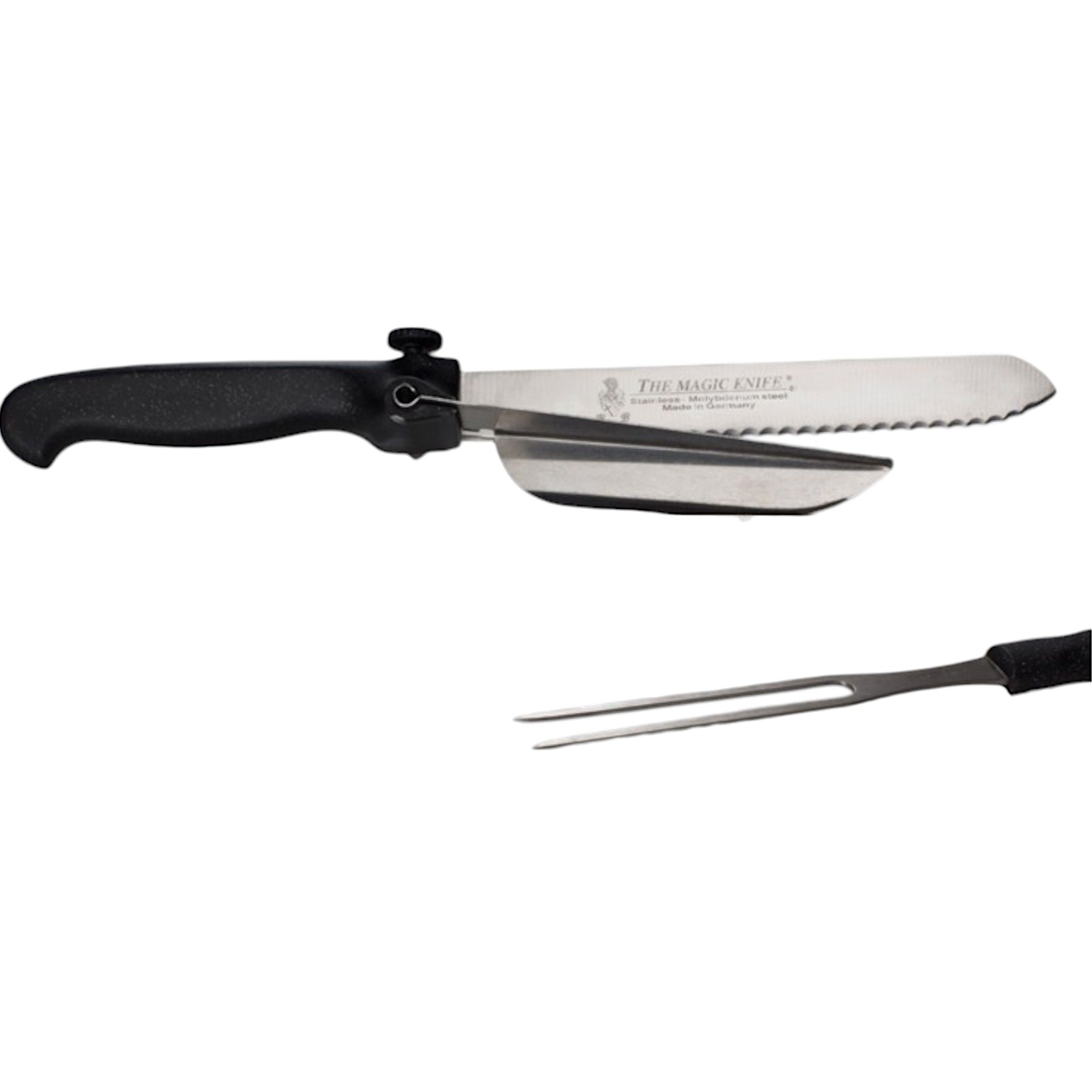 Das Magische Messer für Linkshänder mit Führungsschiene, Aufschnittgabel & Stahl