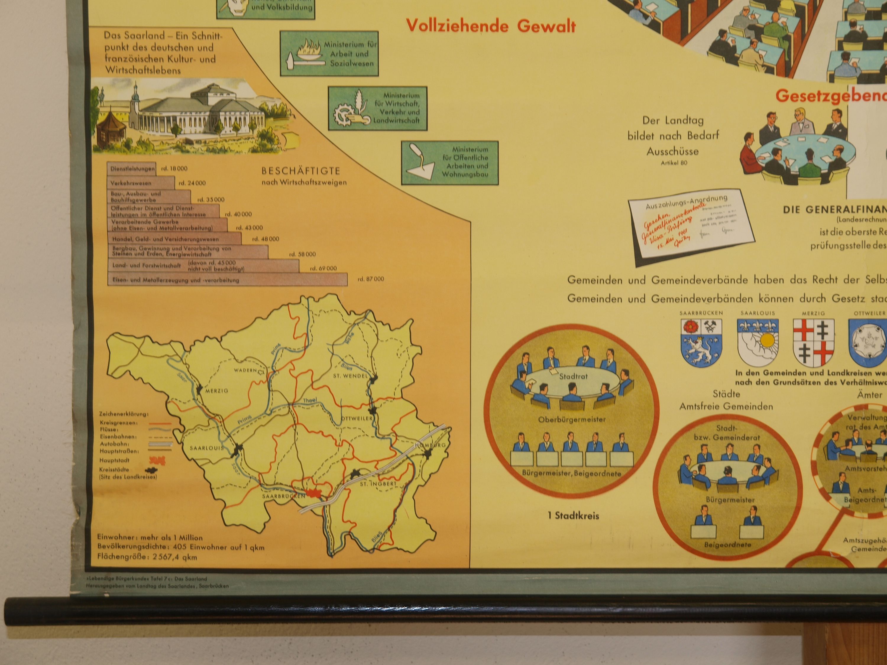 Das Saarland Verwaltung Wirtschaft Wappen 1960 Schulwandbild Wandbild 116x82cm NrL293 Lebendige Bürgerkunde T7c Das Saarland (KX316) Hagemann, 1960, 116x82cm plus Stäbe, oben wasserfleckig, ok powered by plentymarkets