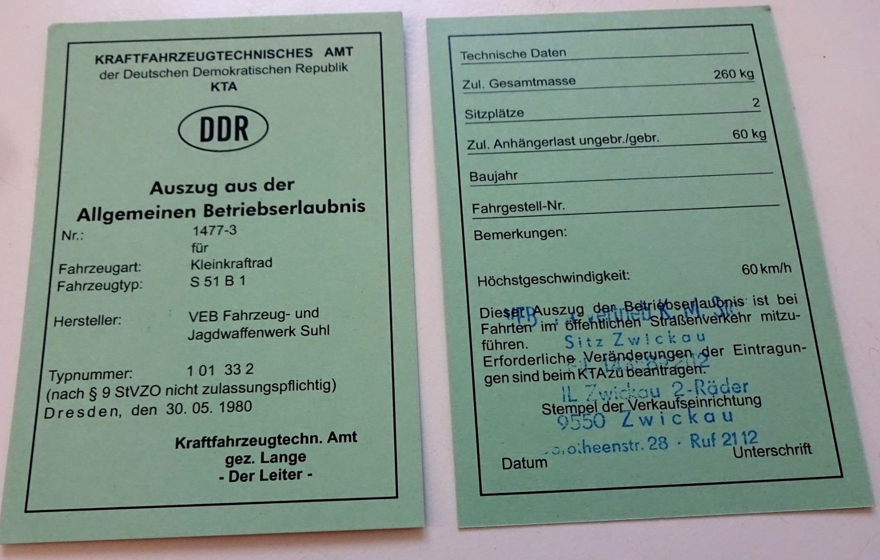 Datenblatt ABE Betriebserlaubnis SIMSON S51 B1 mit echtem DDR IFA VEB Stempel Moped
