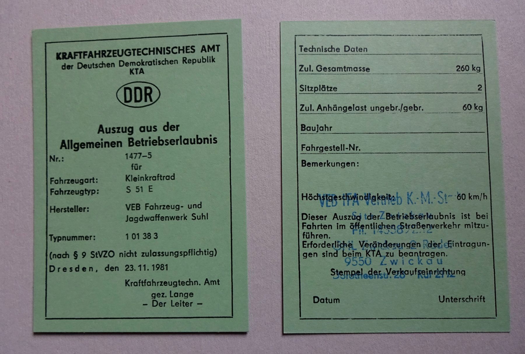 Datenblatt ABE Betriebserlaubnis SIMSON S51E mit echtem DDR IFA VEB Stempel