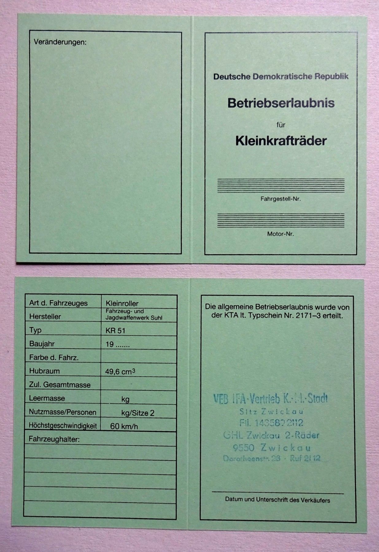 Datenblatt ABE Betriebserlaubnis SIMSON Schwalbe KR51/1 / K / S echter VEB Stempel