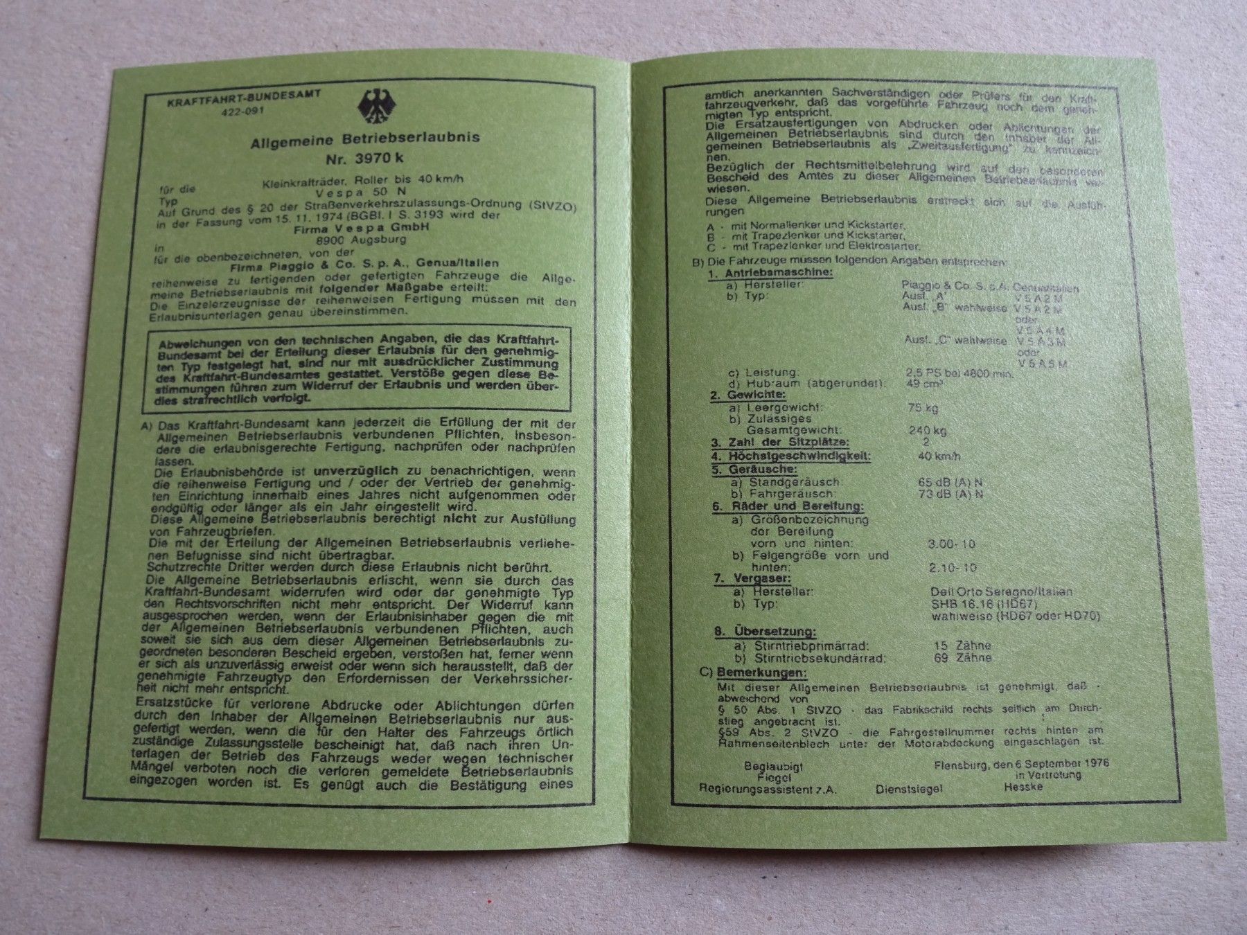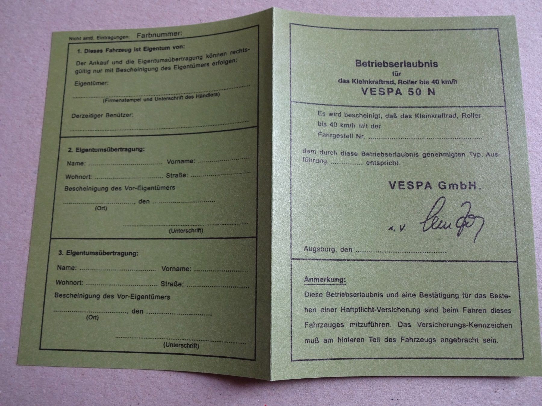 ABE Vespa 50 N - Roller bis 40 Kmh Betriebserlaubnis Blanko PAPIERE REISSFEST als DATENBLATT Info etc grünes Papier Spezialdruck für Sammler... Mehr