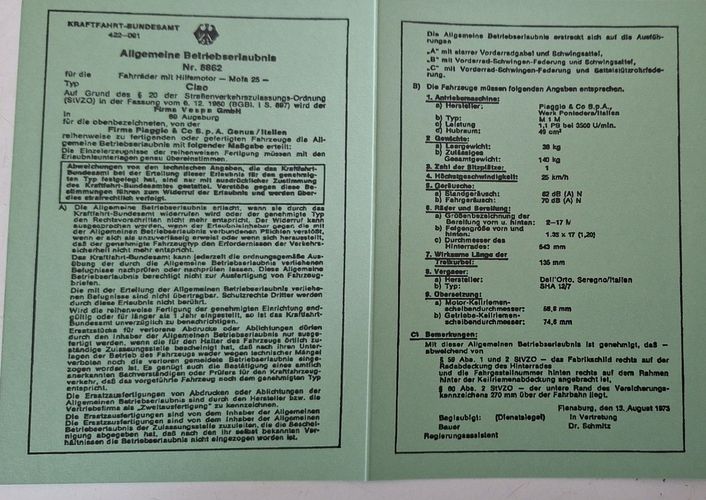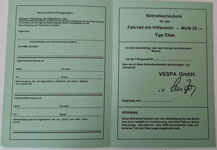 ABE Vespa Ciao - Mofa 25 Betriebserlaubnis Blanko PAPIERE auf Karton als DATENBLATT Info etc grünes Papier Spezialdruck für Sammler... Mehr