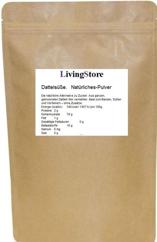 Dattelsüße. Pulver. Natürlich Menge 100gr. Die natürliche Alternative zu Zucker. Aus ganzen, getrockneten Datteln fein vermahlen. Ideal zum Backen, Süßen und Verfeinern – ohne Zusätze. Was ist DattelsüßeEuro Dattelsüße Pulver Natürlich ist ein naturbelassenes Süßungsmittel aus getrockneten Dat