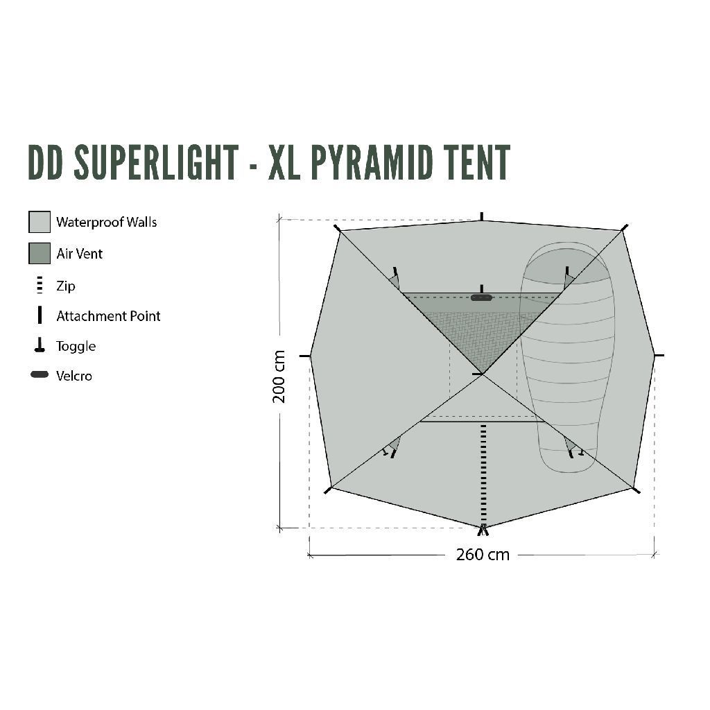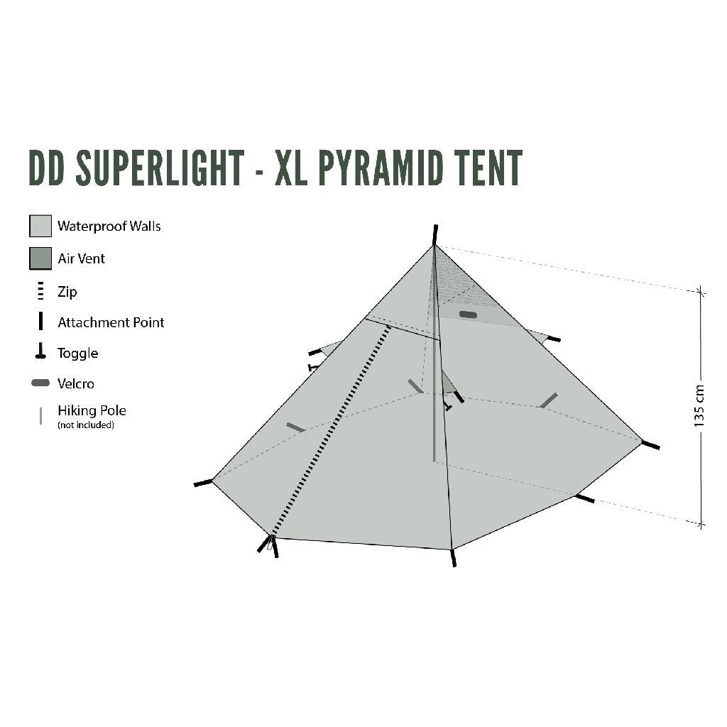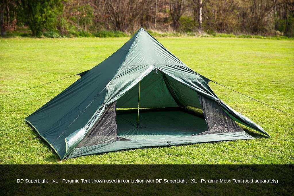 <p>Das Pyramid Tent XL von DD Hammocks ist eine superleichtes Zweimannzelt ohne Rahmen. Das Außenzelt dient als Dach als Schutz gegen Regen, Wind und als Sichtschutz. Dieses extra große Zelt für zwei Personen ist von oben 100% wasserdicht ist aber ohne Boden. Zeltboden und Insektenschutz bietet