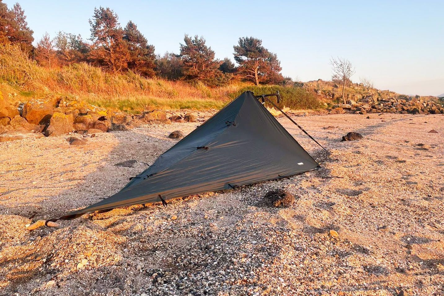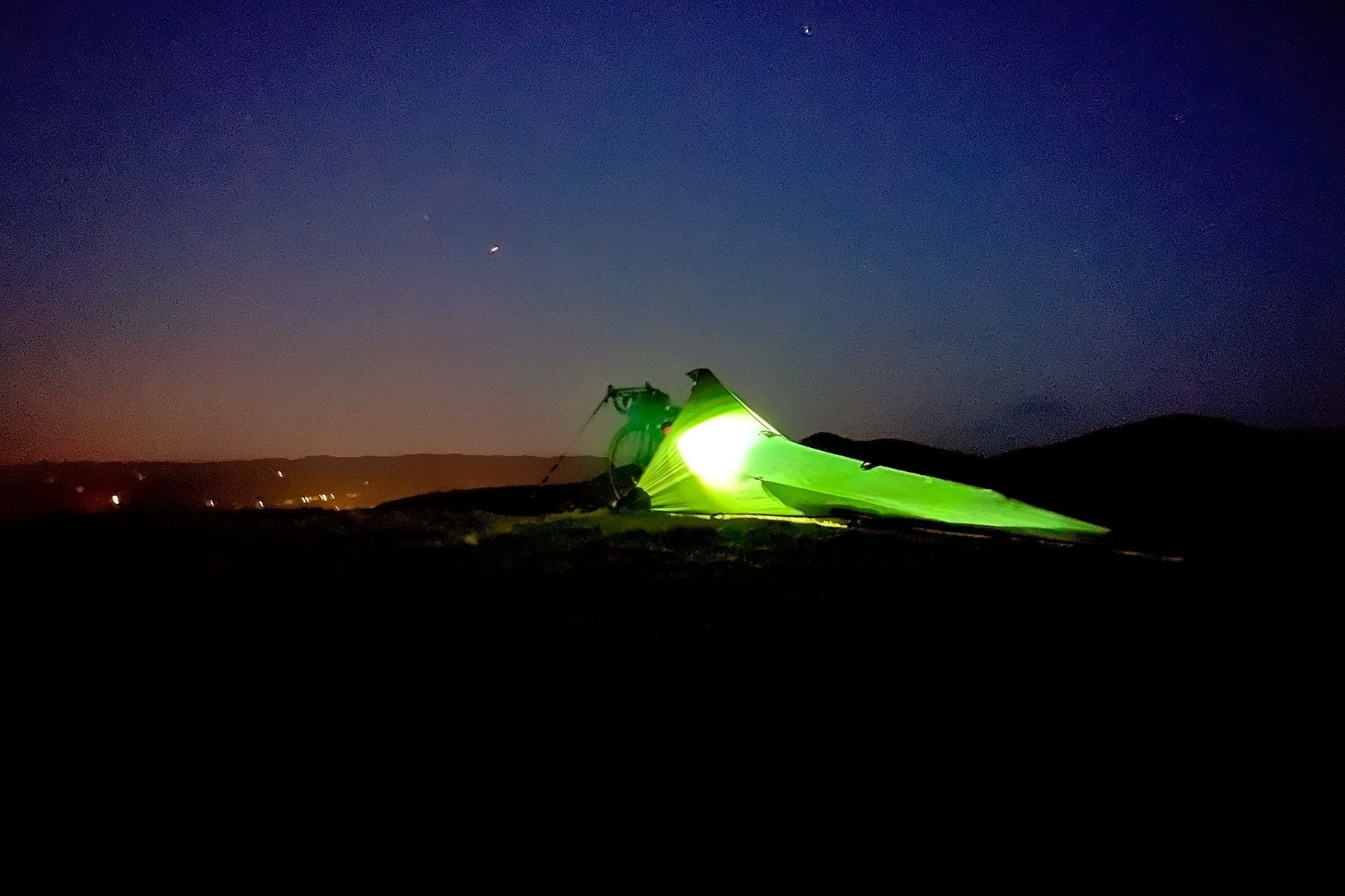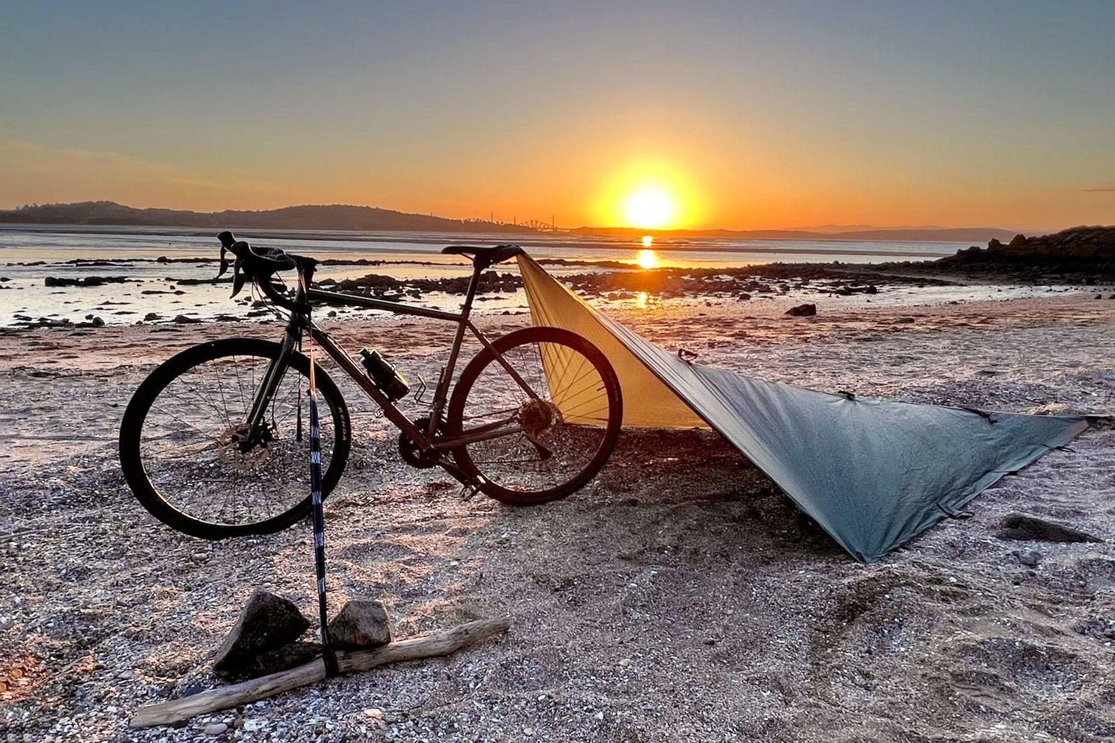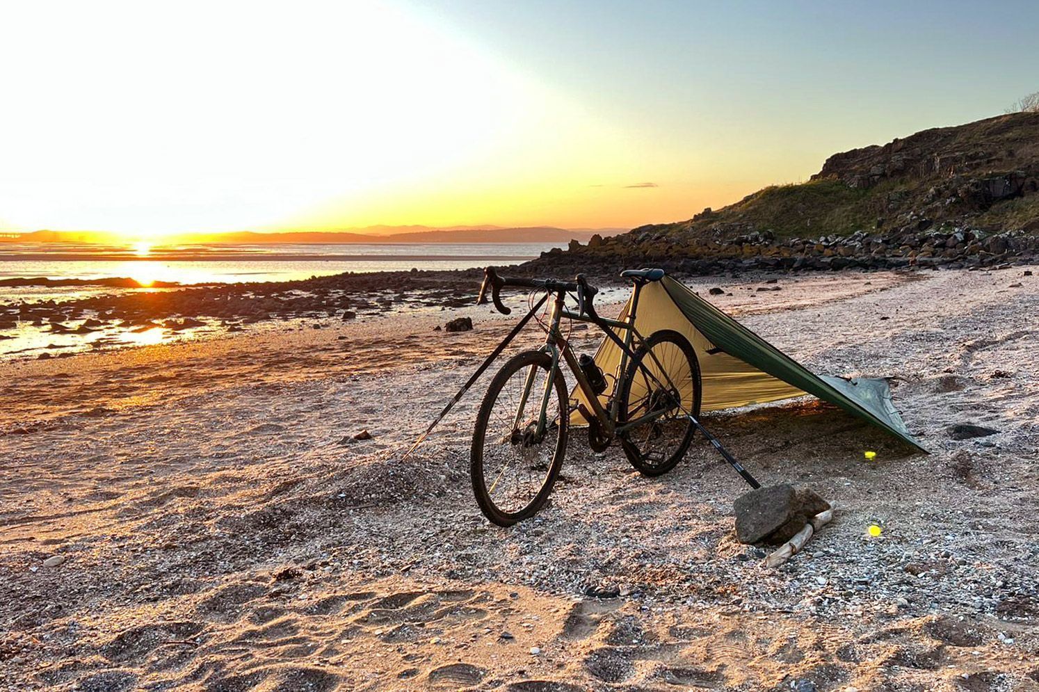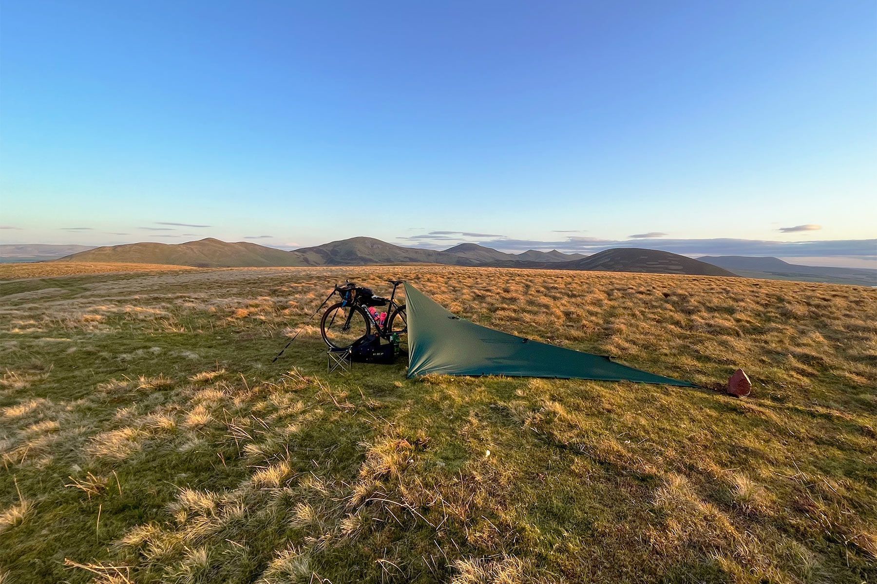 Dieses grüne Tarp von DD Hammocks wurde speziell für Radfahrer, Radwanderer und Bikepacker entwickelt. Beim Aufbau des Tarps wird der Fahrradsattel als Stütze verwendet, ein Verankerungsriemen, der am Lenker befestigt wird, stabilisiert das Fahrrad. Die Plane ist 3,7 x 2,3 Meter groß und wiegt ohne