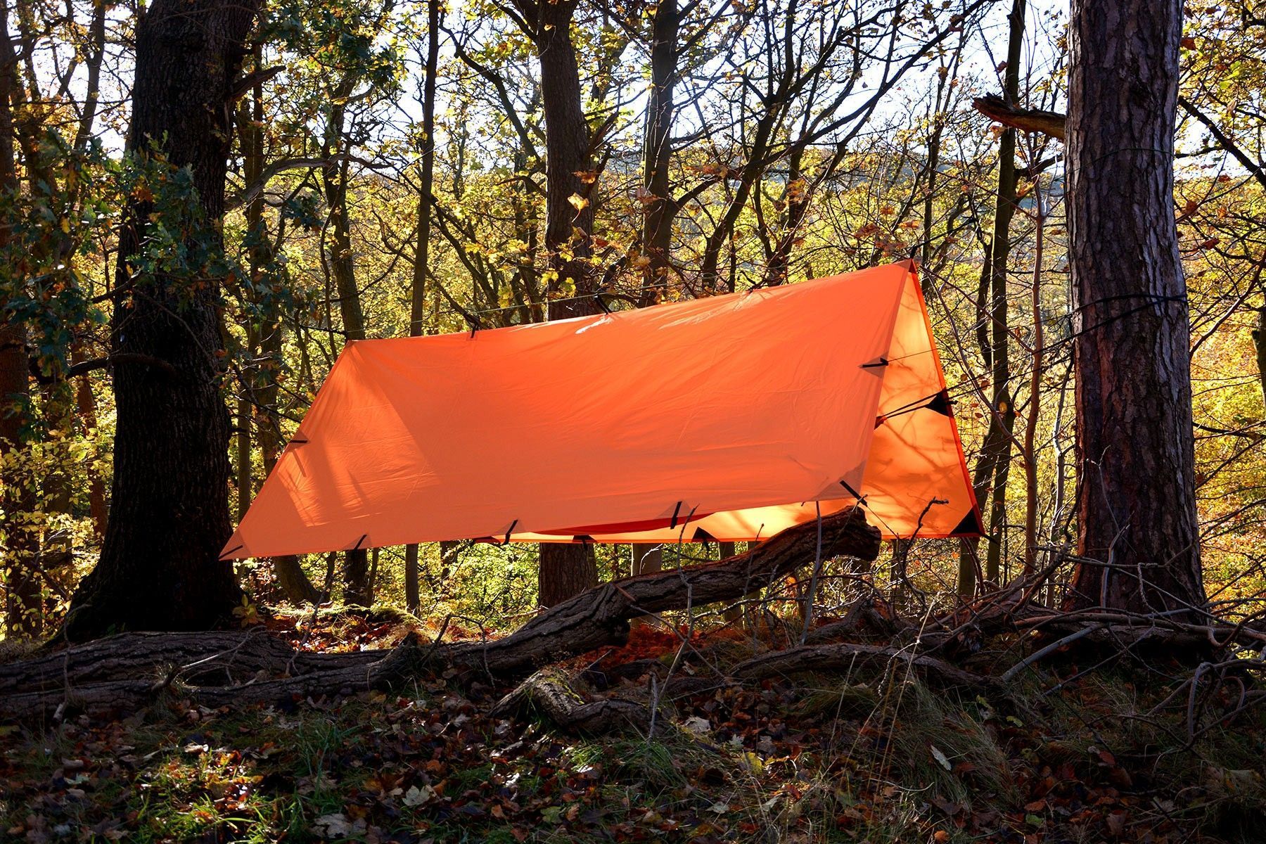 Das orange Regendach von DD Hammocks ist aus 3000mm PU beschichtetem Polyester. Die Nähte sind versiegelt. Das grüne DD Tarp ist quadratisch und 100% wasserdicht. Die insgesamt 19 Fixierungspunkte bieten viele Montagemöglichkeiten. So kann man die Plane wie ein Zelt am Boden oder als Dach über eine