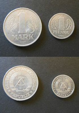 1 Marke Münze DDR 1977 und 1 Pfennig Münze DDR 1985