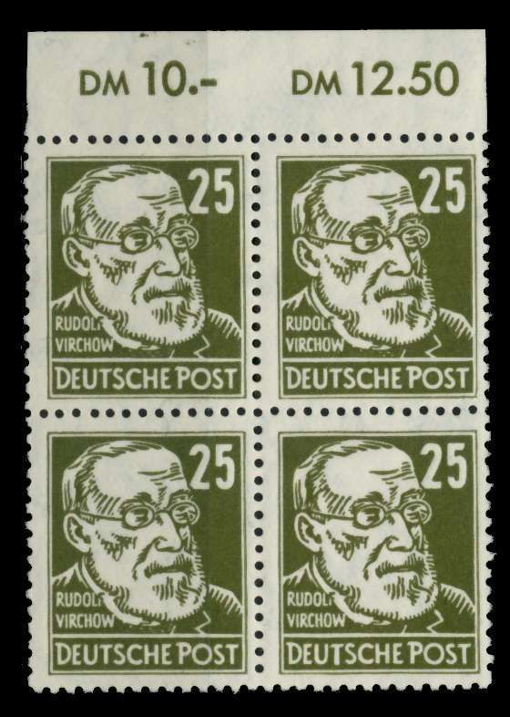 DDR 1952 Nr 334zXI postfrisch VIERERBLOCK gepr. 25 Pfg Wert aus der Ausgabe Persönlichkeiten (Köpfe) - Rudolf Virchow, im Oberrandbereich kleiner Falzrest, Marken alle postfrisch und einzeln signiert 345.61€ incl. MwSt: Differenzbesteuert zzgl. Versandkosten Bestell-Nr.: 71378E Katalog-Nr: MICH