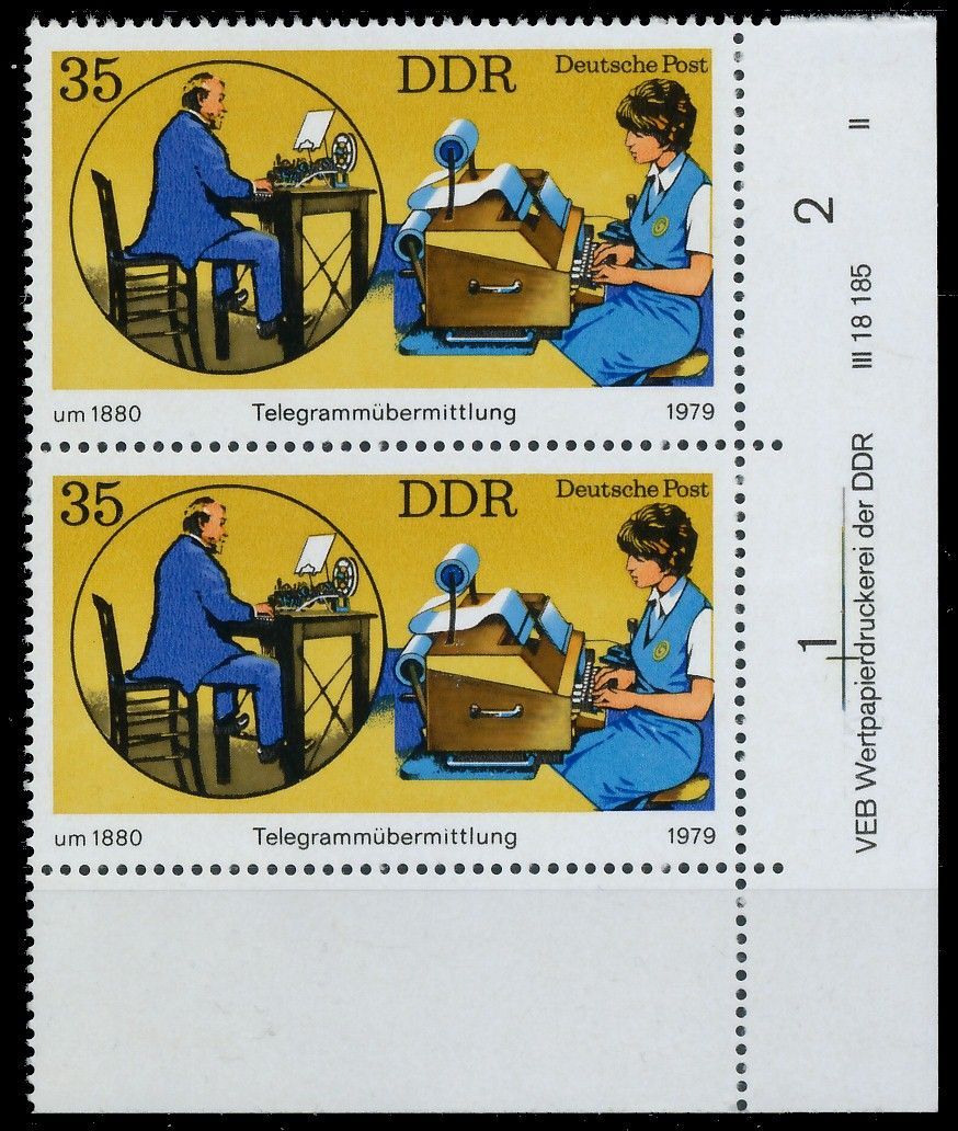 DDR 1979 Nr 2401DV WPD II postfrisch SENKR PAAR ECKE-UR 35 Pfg Wert aus der Ausgabe Fernsprech- und Telegrammübermittlung 2.60€ incl. MwSt: Differenzbesteuert zzgl. Versandkosten Bestell-Nr.: AAF1DA Katalog-Nr: MICHEL (2401 DV WPD II) Katalogpreis: 6 EUR Qualität: Normal Erhaltung: Postfrisch *