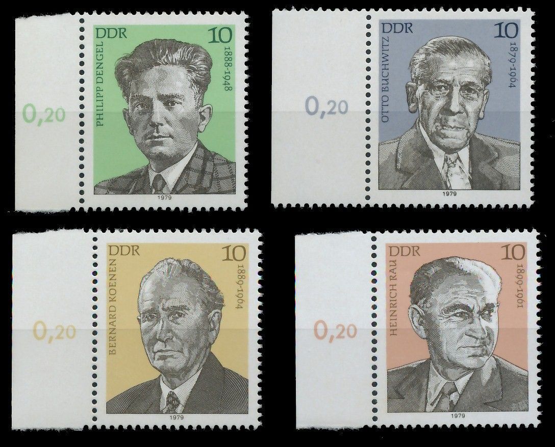 DDR 1979 Nr 2454-2457 postfrisch SRA Ausgabe Persönlichkeiten 0.55€ incl. MwSt: Differenzbesteuert zzgl. Versandkosten Bestell-Nr.: AAF4DE Katalog-Nr: MICHEL (2454 - 2457) Katalogpreis: 1,20 EUR Qualität: Normal Erhaltung: Postfrisch ** Einheit: Satz Bogenlage: Seitenrandstück Gummierung: Geprü