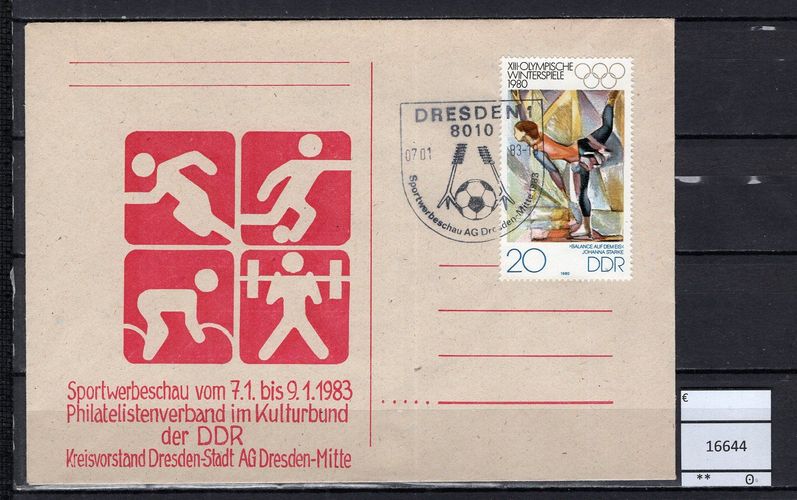DDR 1983 Sonderbeleg Sportwerbeschau AG Dresden-Mitte Schmuck-Beleg mit MiNr. 2479 Sonderstempel Dresden Michelkatalogpreis -€ Ich löse meine umfangreiche Briefmarkensammlung auf. Beim Kauf mehrer Artikel zahlen Sie nur die tatsächlich anfallenden Versandkosten, diese richten sich nach dem Gewi