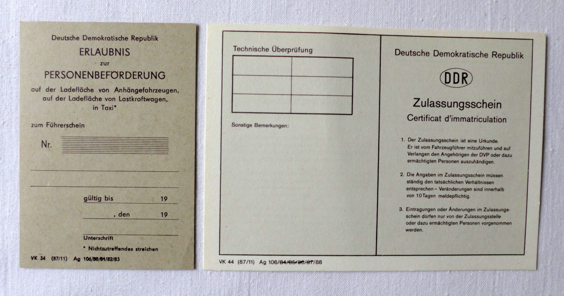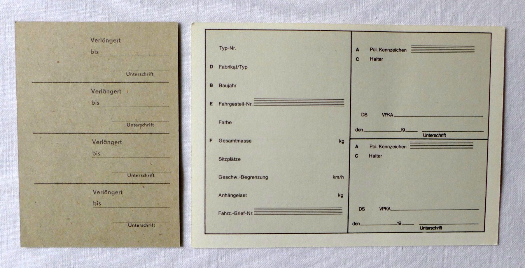 DDR blanko KFZ Zulassungsschein MZ Trabant Wartburg Erlaubnis zur Personenbeförderung