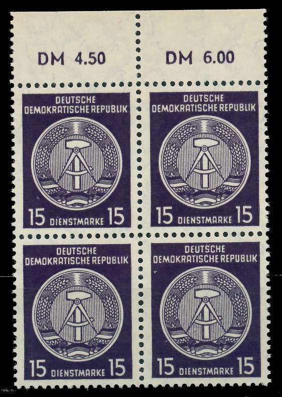 DDR DIENST HAMMER ZIRKEL Nr 36yBY postfrisch VIERERBLOC 15 Pf Wert aus der Dienstmarkenausgabe Verwaltungspost B Staatswappen der DDR, Zirkelbogen nach rechts, Bdr., Faserpapier, neues Wasserzeichen Kreuzblüten (WZ3), gez. K14 2.71€ incl. MwSt: Differenzbesteuert zzgl. Versandkosten Bestell-Nr.