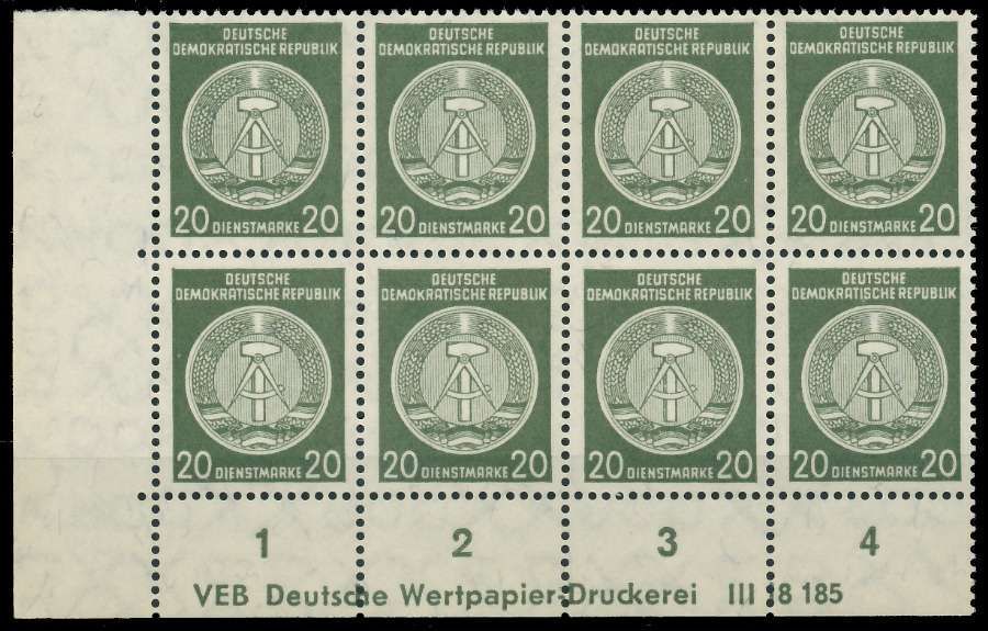 DDR DIENST HAMMER ZIRKEL Nr 37yBY DV postfrisch SO ECKE 20 Pf Wert aus der Dienstmarkenausgabe Verwaltungspost B Staatswappen der DDR, Zirkelbogen nach rechts, Bdr., Faserpapier, neues Wasserzeichen Kreuzblüten (WZ3), gez. K14, 8er Block mit Druckvermerk 3.52€ incl. MwSt: Differenzbesteuert zzg