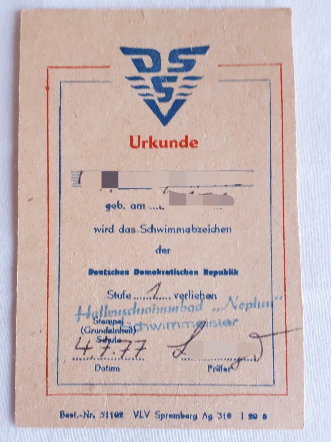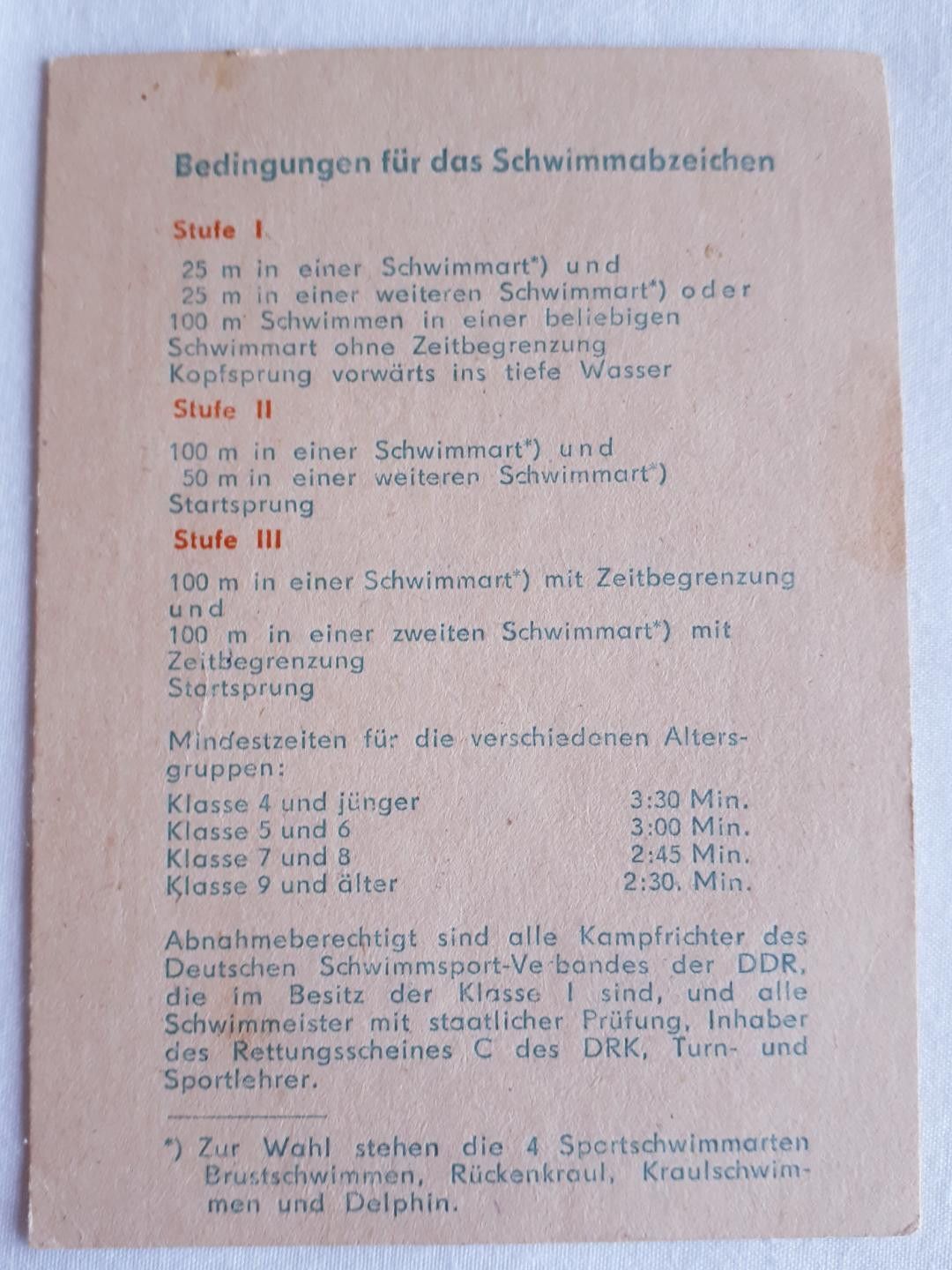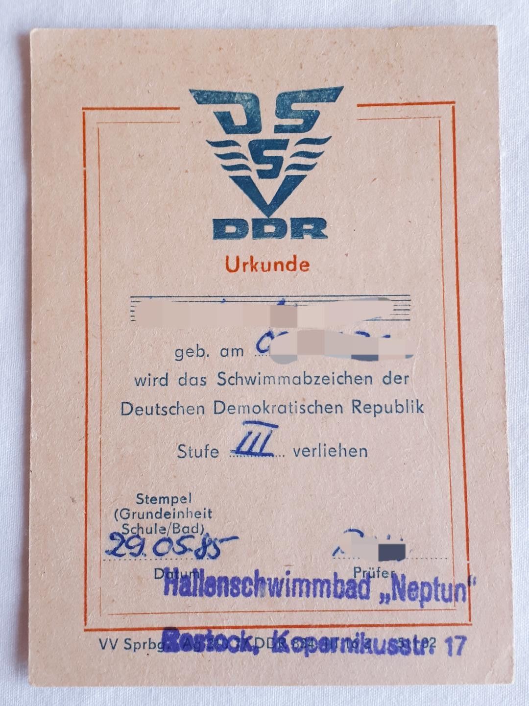 DDR DSSV Urkunde Schwimmabzeichen Stufe I bis III