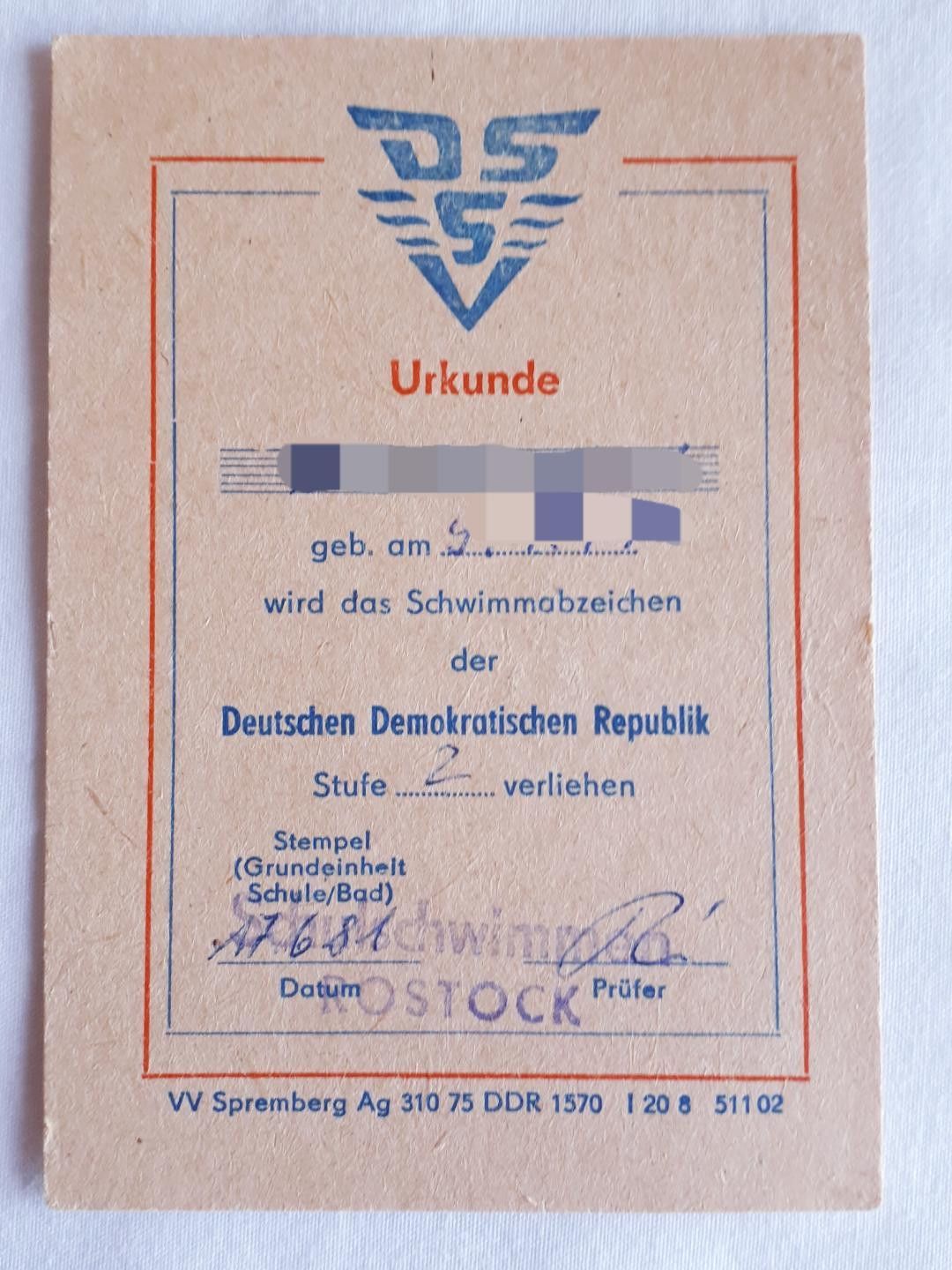 DDR DSSV Urkunde Schwimmabzeichen Stufe I bis III R. * ausgestellt für eine Frau * die gewünschte Stufe bitte in der Liste auswählen! Zustand: gut - gebraucht mit kleinen Gebrauchsspuren