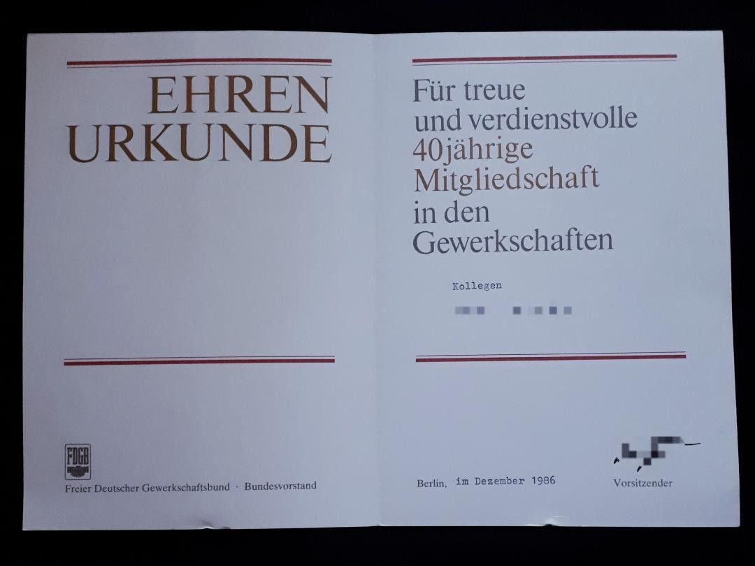 DDR FDGB Ehrenurkunde für 40jährige Mitgliedschaft Dezember 1986 R. * A5 Maß (zusammengeklappt) Zustand: gut - gebraucht mit Gebrauchsspuren (Urkunde ist leicht verschmutzt, Bräunungsspuren, kleine Knicke und bestoßene Ecken bzw.Blattränder kommen vor)