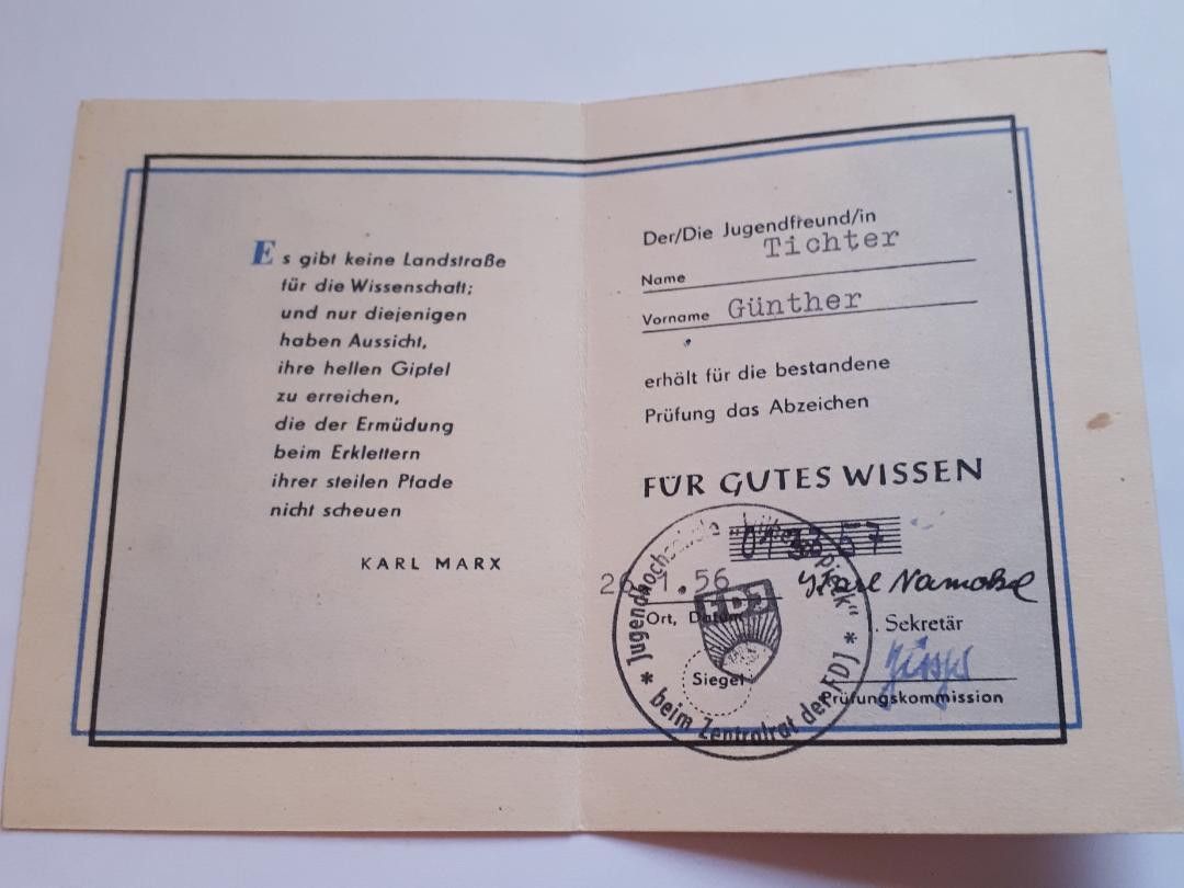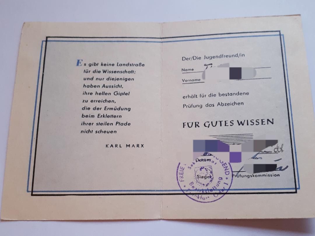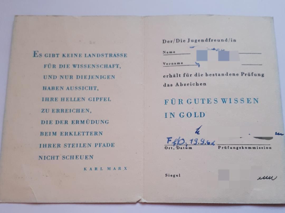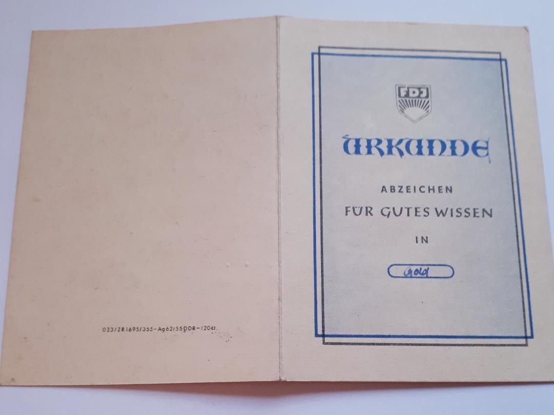 DDR FDJ Urkunde Für gutes Wissen in Gold