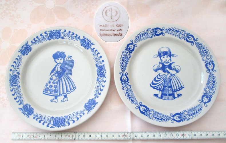 DDR Geschirr * Colditz Keramik 2 Teller Ø 19 cm bemalt mit Trachtenfigur & ragekiepe