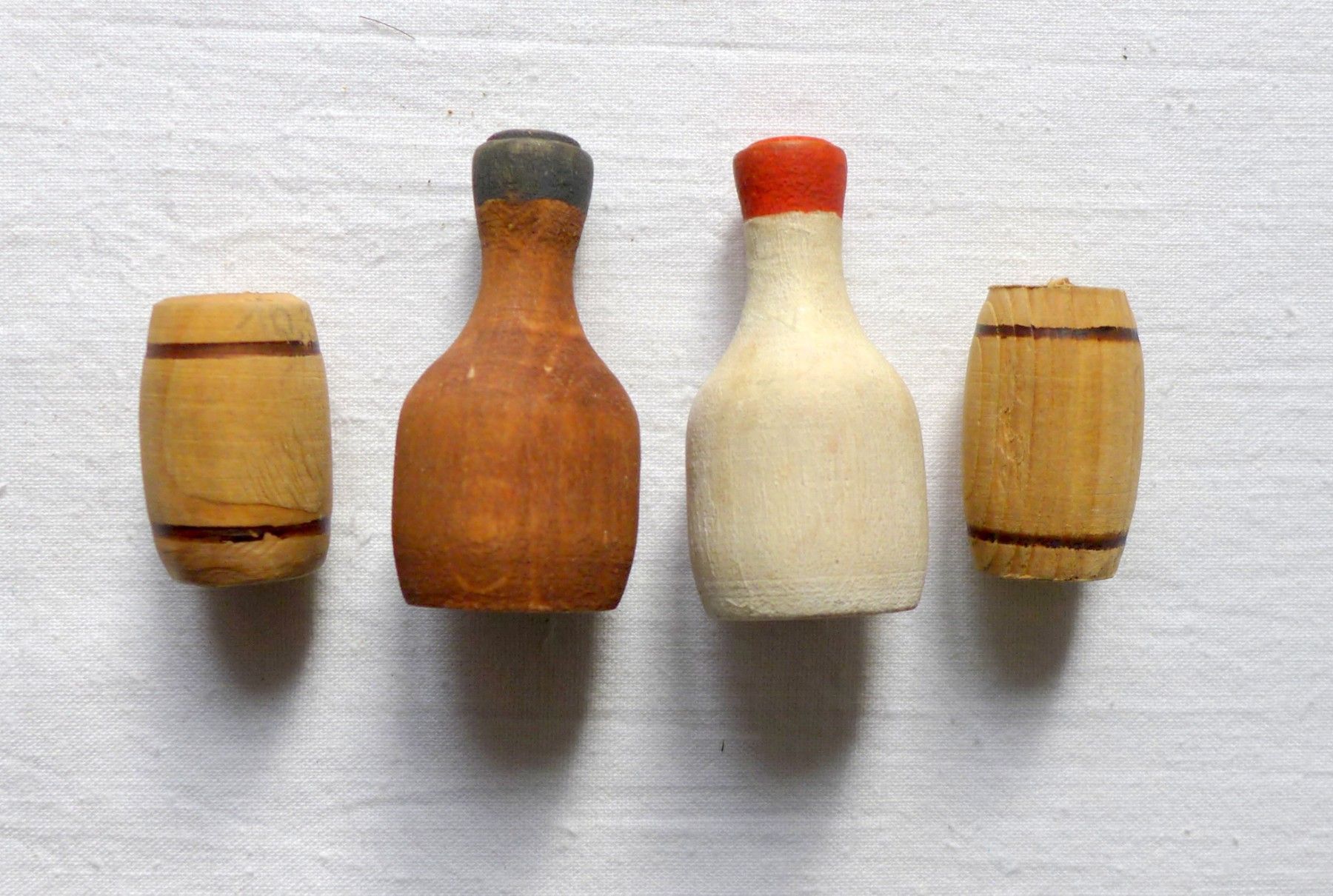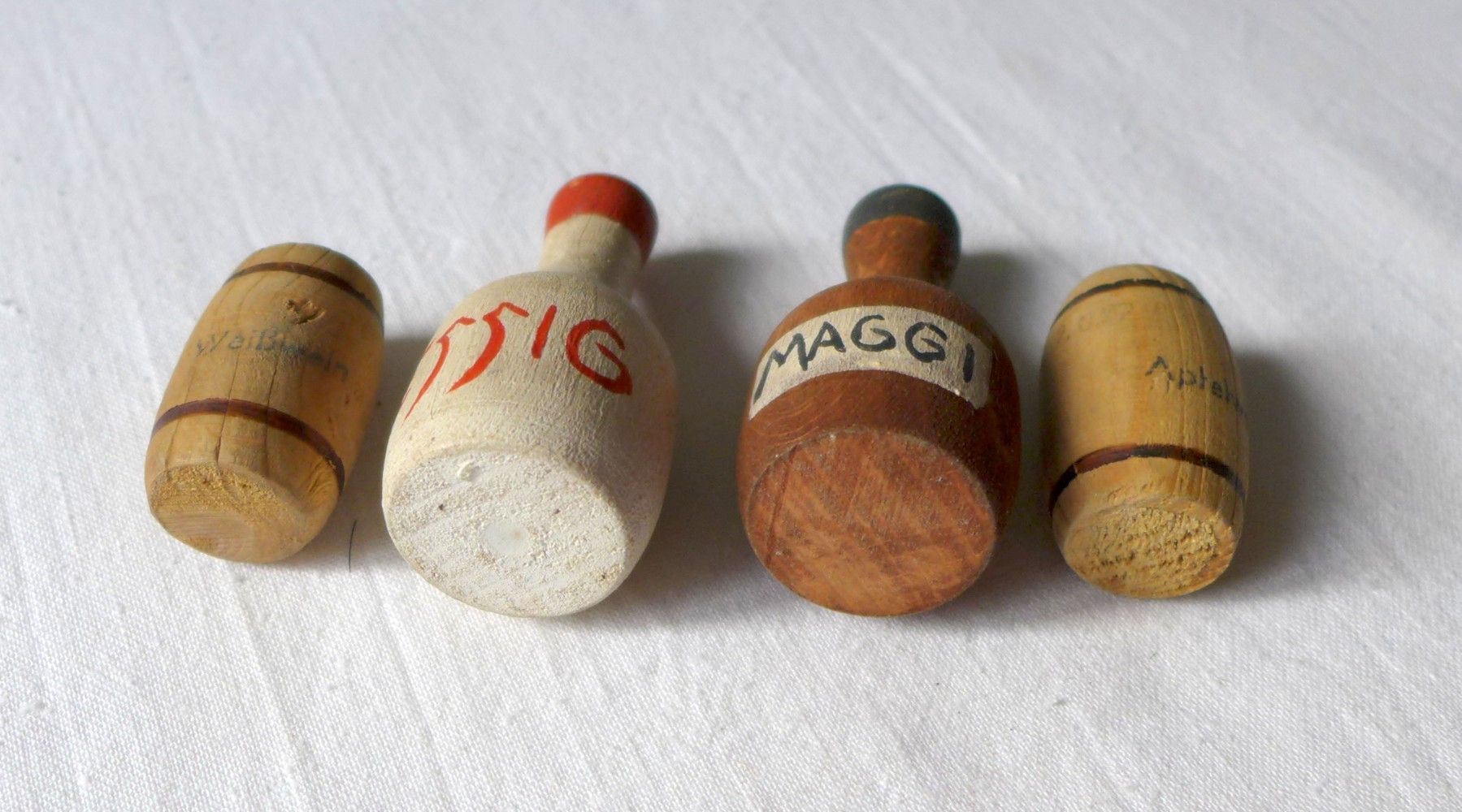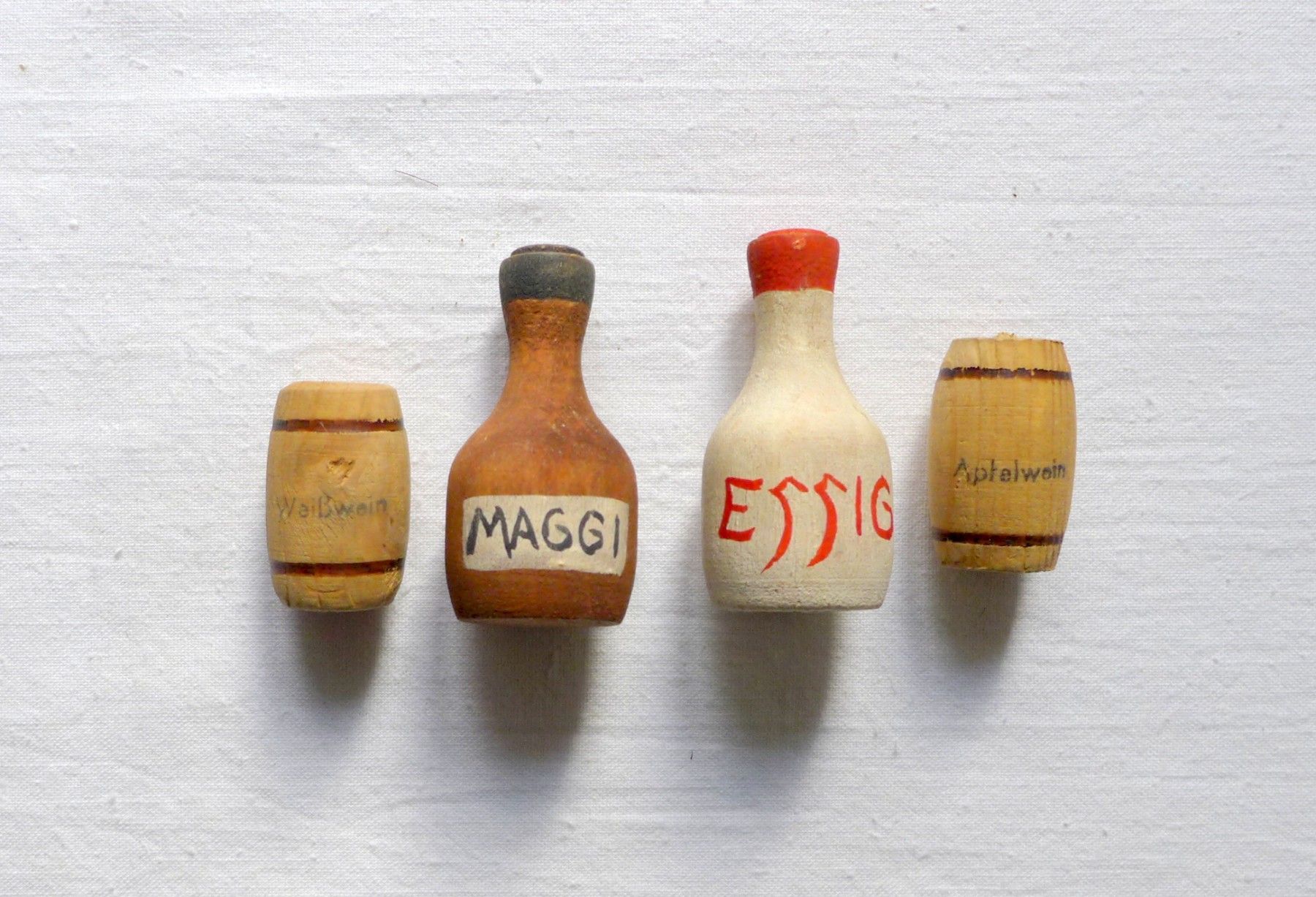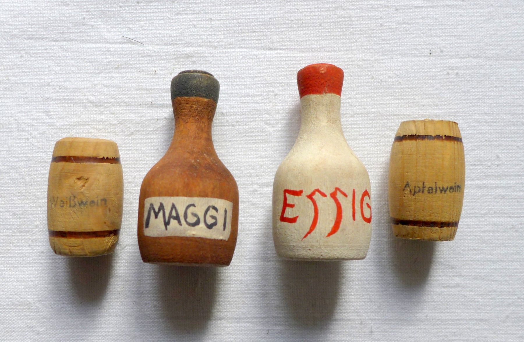 gebrauchter Zustand , Gebrauchs - Lagerspuren siehe Fotos , bespielt , Essig , Maggi : Höhe ca. 6 cm , Durchmesser ca. 3 cm , Holzfässer : Höhe ca. 3,7 cm , Durchmesser ca. 23 mm , Lichtspiegelungen , Schattenbildung , Farbabweichungen können beim fotografieren auftreten , Sp 184 Achtung ! Nicht für